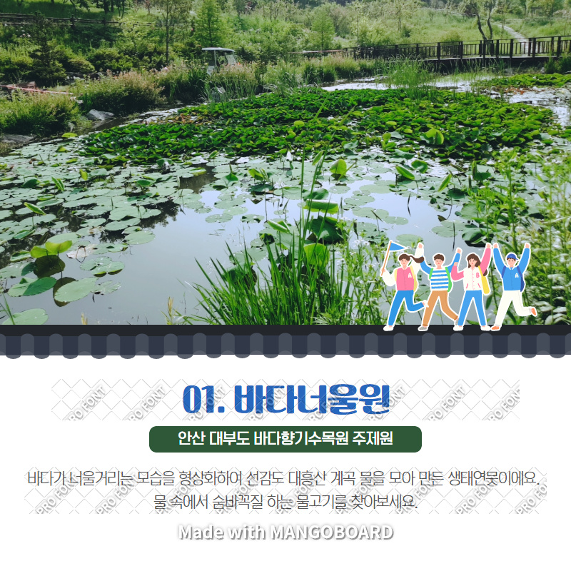 메인 주제원인 바다너울원에 도착했어요. 계곡 물을 모아 만든 생태연못이라고 해요. 아직 보수 중이라서 반대쪽 데크는 출입이 불가했지만 울창한 연잎이 참 인상깊었어요. 흔치 않은 그늘이 있는 벤치에 앉아 살짝 쉬어갔어요. 은근 쉴만한 벤치가 없으니 앉아서 휴식을 취하는 것을 추천해요.