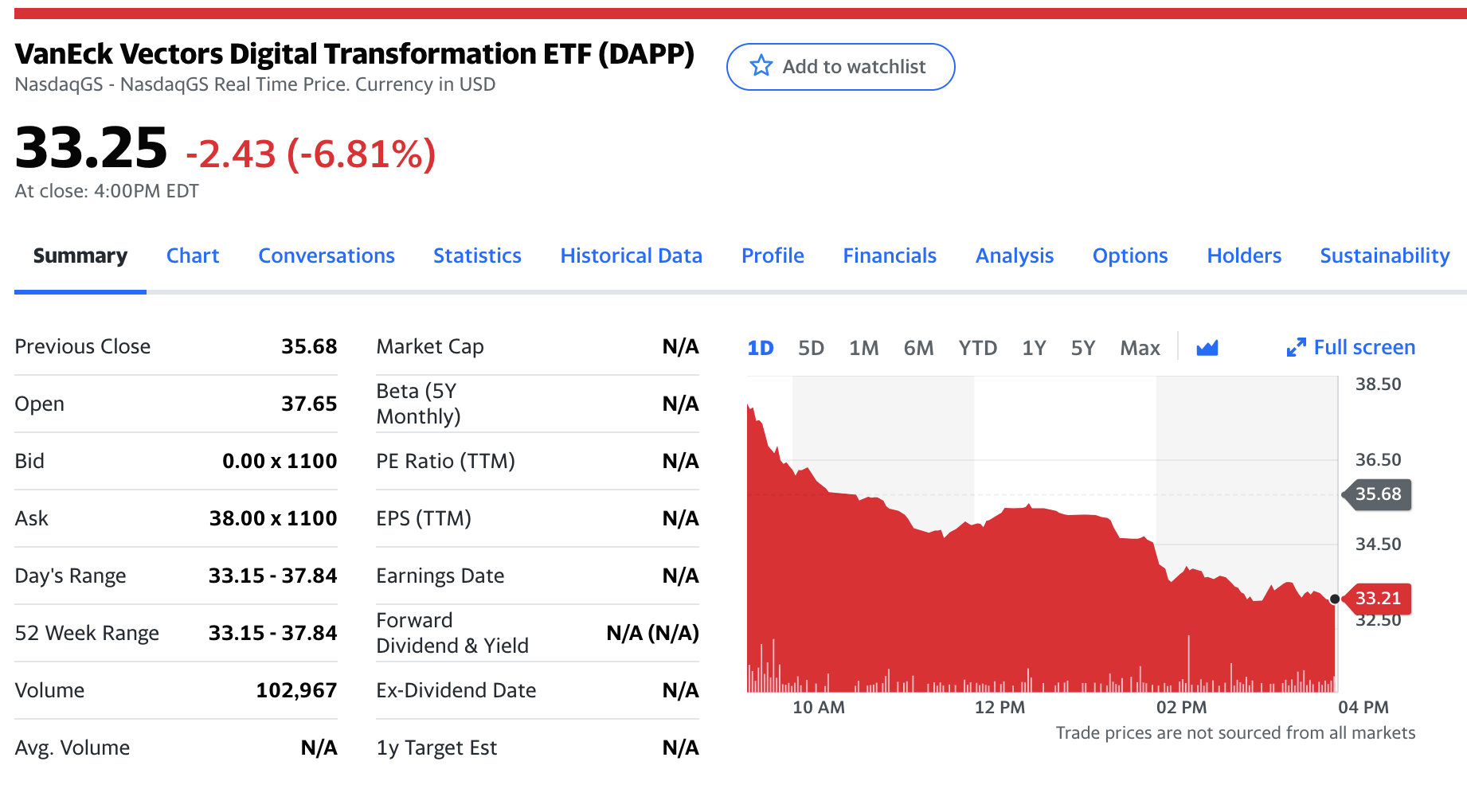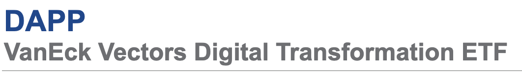 티커명은 DAPP, 풀 네임은 VanEck Vecrors Digital Transformation ETF입니다. 풀 네임을 가만히 들여다보면 디지털 변환, 변혁의 의미이기 때문에 가상화폐 관련 투자는 아닌것 같은데..? 싶으실겁니다. 반에크 매니저에 따르면 애초에 풀 네임에 가상화폐, 비트코인, 블록체인, 디지털 화폐 등의 단어를 포함하면 허가가 되지 않을 것 같아 Digital Transformation으로 명명했다고 합니다. 그나마 순화해서 Digital Asset(디지털 자산)으로 명명하려던 것도 포기하고요.