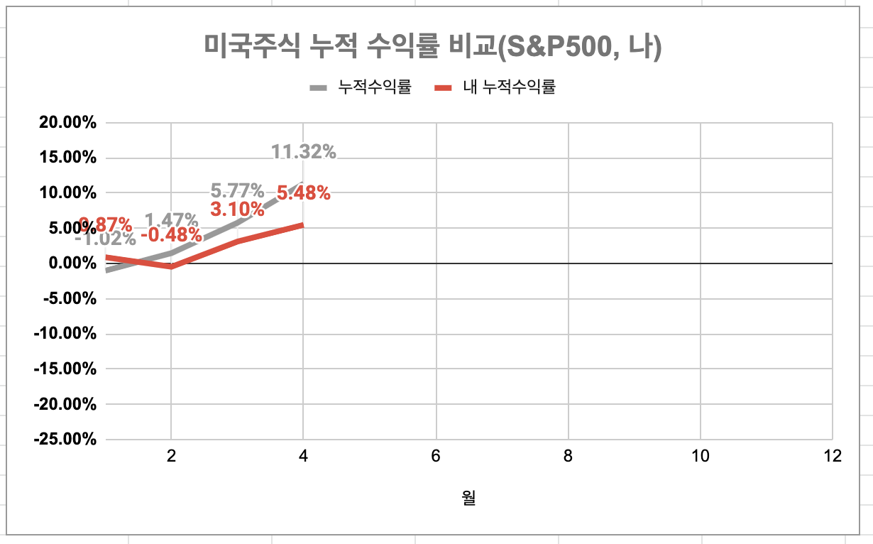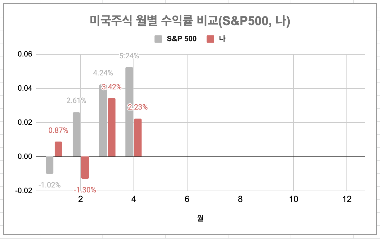 개인적인 일로 분주하게 지나간 4월입니다. 제 포트폴리오도 4월 초에는 반짝 좋더니 월말이 되자 3월 수익률로 되돌아온 것 같은데요. 4월에는 개인적인 일과 SK iet 공모주로 미국주식에 큰 신경을 쓰지 못했습니다. 2월과 같은 하락장이 오지 않아서 좀 더 소홀했기도 하고요. 오히려 하락장에 더 무뎌져야 하는데 상승장에만 무뎌지는 제 태도를 반성하게 되네요..ㅎㅎ 전반적으로 아쉬운 4월로 남지만 포스팅 작성하도록 하겠습니다.