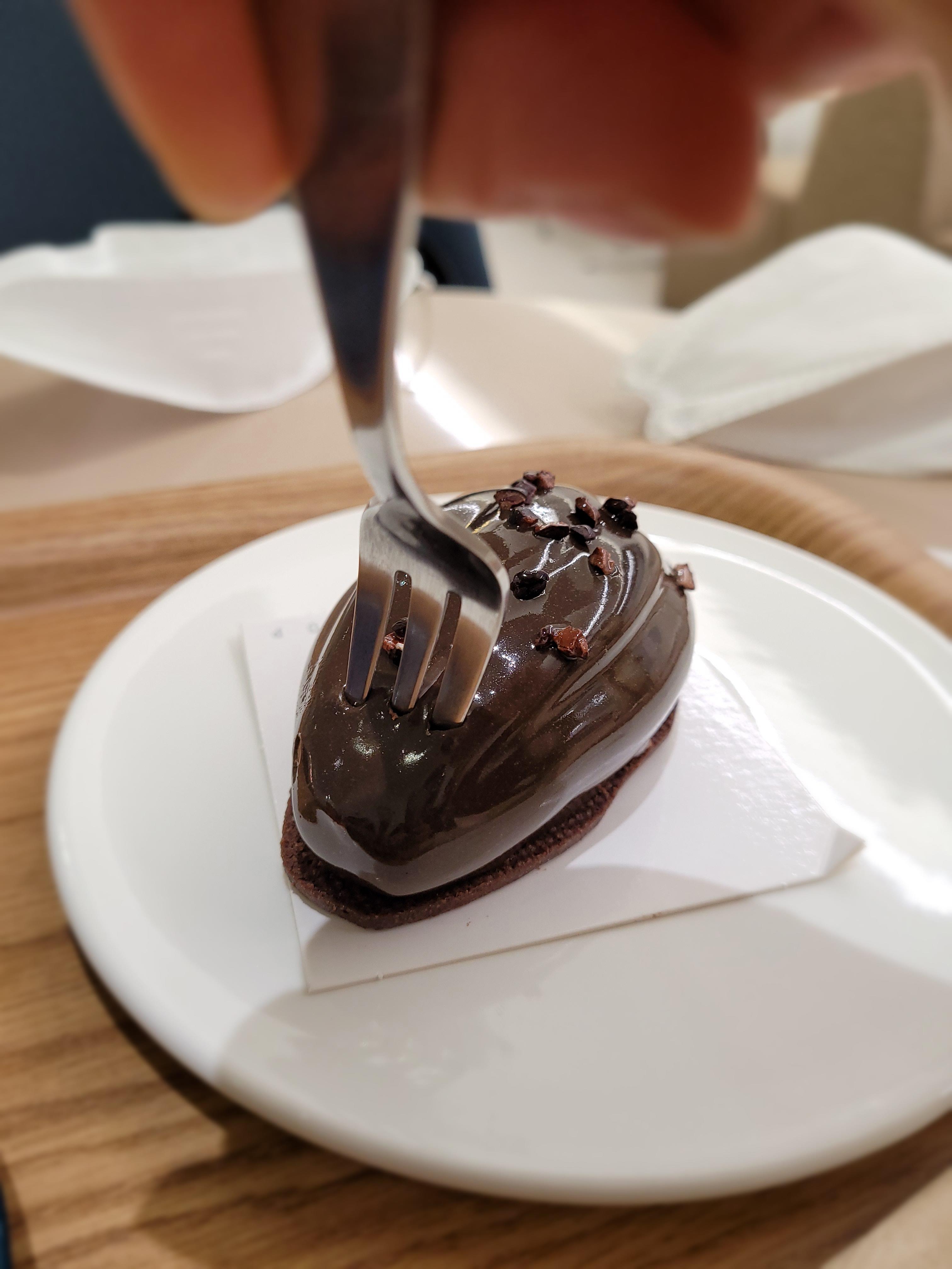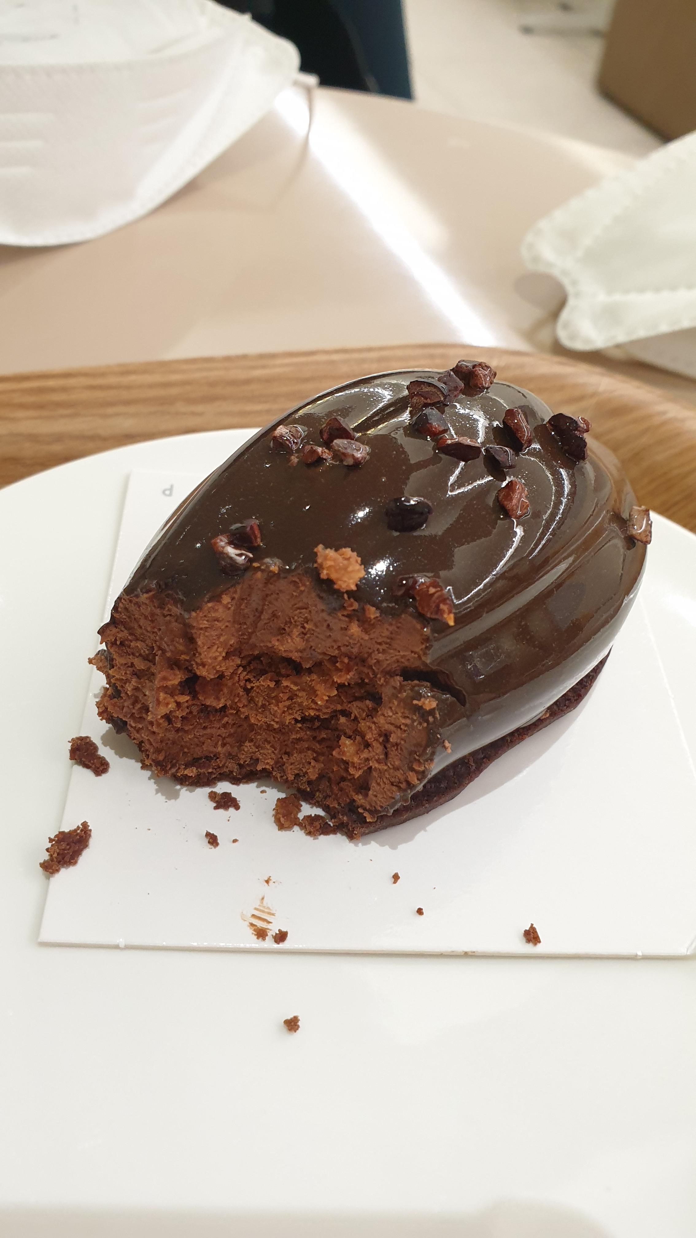 케이크 비주얼만 봐도 초콜릿 코팅에서 달달함이 느껴지지 않나요? 케이크 안쪽을 보시면 빵 시트라기 보다는 꾸덕한 초코무스와 파베초콜릿을 먹는 느낌이 들어요. 중간중간 누텔라와 초코알이 박혀있기도 하고요! 저에게는 달아서 한 입에 삼키기 어려웠지만 프라푸치노, 초코 달달구리를 좋아하시는 분들이라면 취향저격 하실 거에요.ㅎㅎㅎ 남자친구의 최애 디저트로 등극했습니다!ㅋㅋㅋ