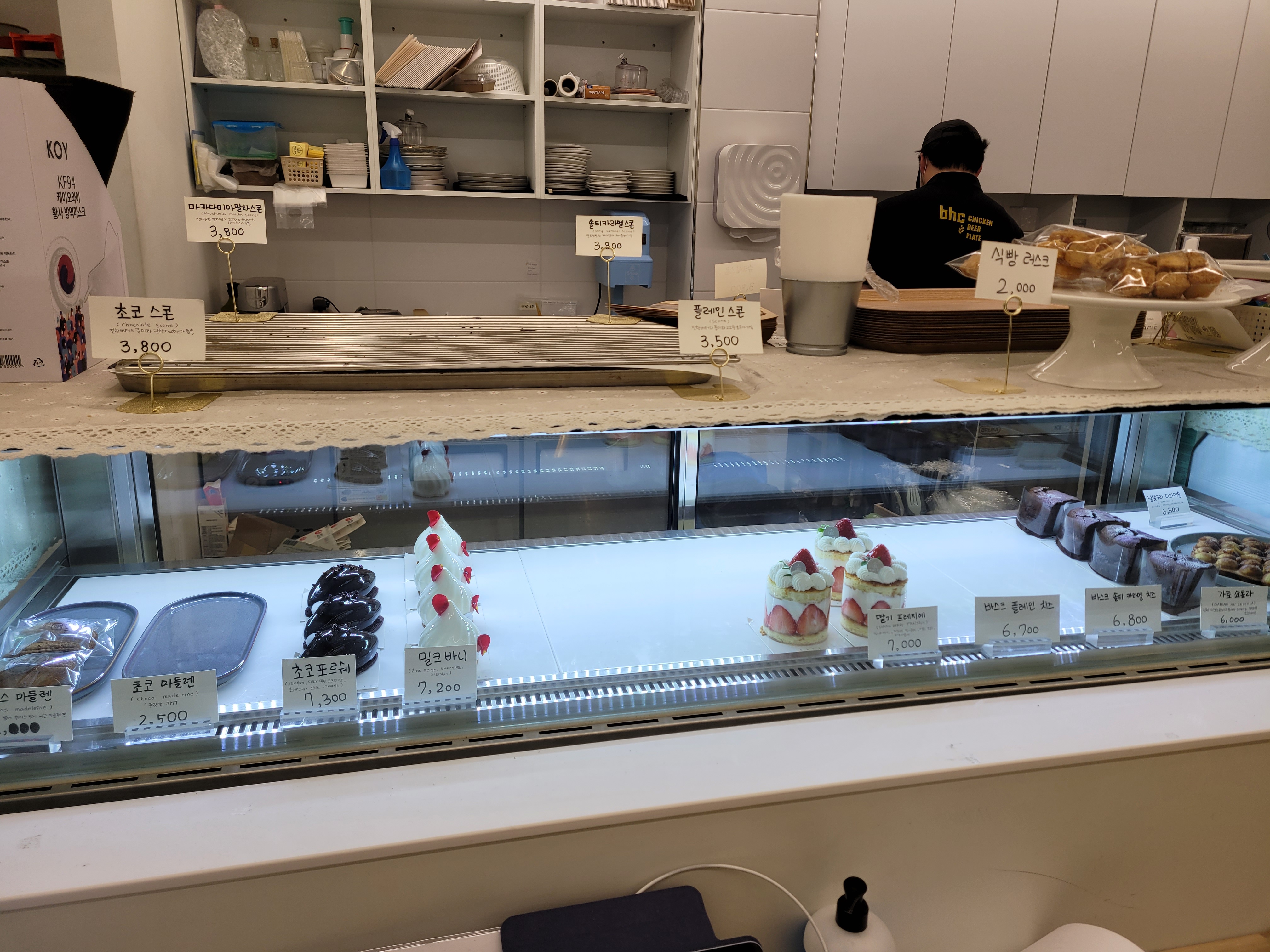 진열대에는 스콘은 이미 품절이었어요ㅠㅠㅠ 초코 마들렌과 바스크 치즈케이크도 역시 품절이었습니다. 비주얼 상으로 제~일 달달한 맛을 자랑할 것 같은 초코 포르쉐 보이시나요? 딸기 프레지에도 맛있어 보였지만 프레지에류는 먹기가 불편해서 선택안에서 제외했습니다.