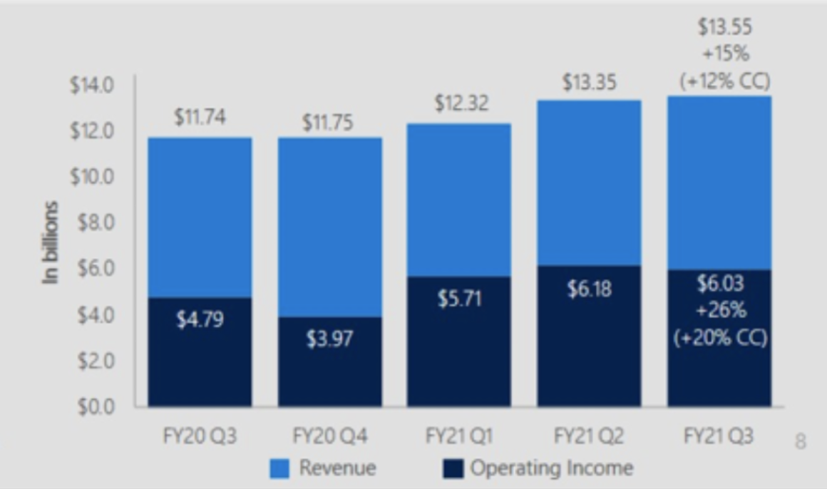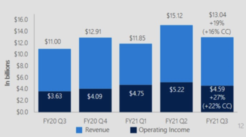 생산성 및 비즈니스 프로세스 부문은 135억 불의 매출을 냈고, 영업이익은 약 60.3억 불 정도 됩니다. 매출은 15% 상승한 반면 영업이익은 26% 상승하였으니 마진이 높아진 셈입니다. 그 중에서도 매출 상승은 오피스 365와 링크드인이 이끌었다고 밝혔고요.