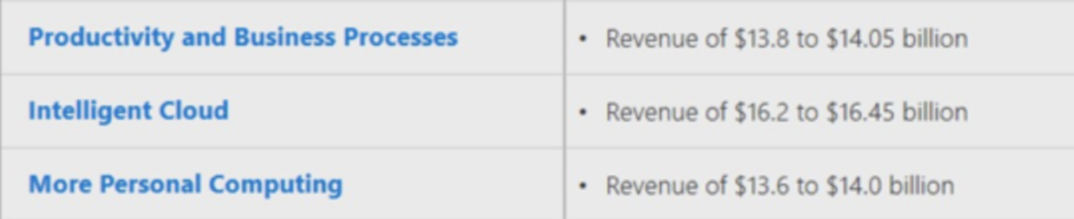 마이크로소프트의 매출 가이던스는 우선, 이번 분기에 비해 세 부문 모두 증가한다는 전망을 내놓았습니다. 실적발표 당시 마이크로소프트의 임원진은 클라우드의 밝은 전망을 강조하였는데, 그에 걸맞게 클라우드 부문의 성장이 돋보일 전망입니다.