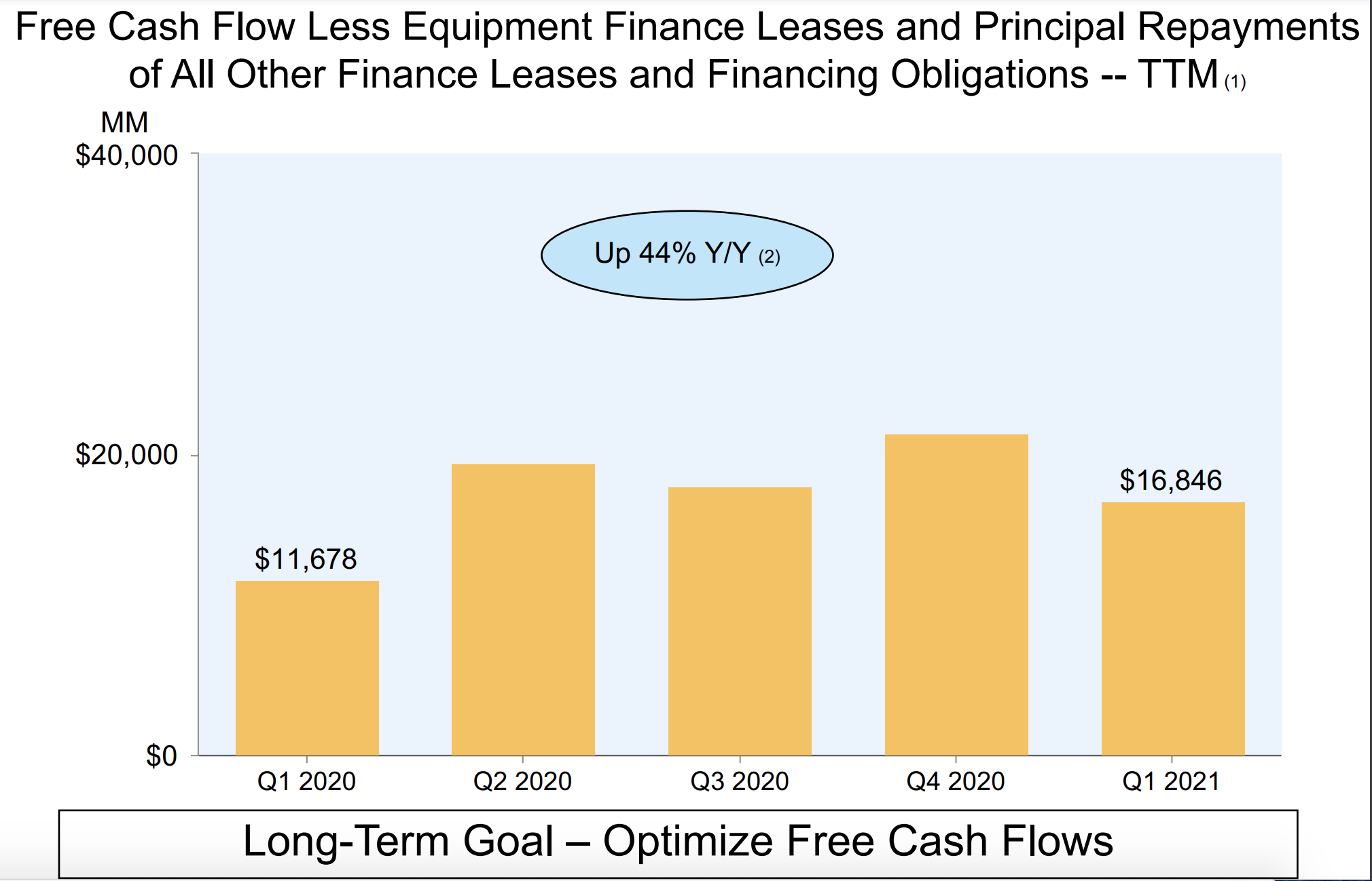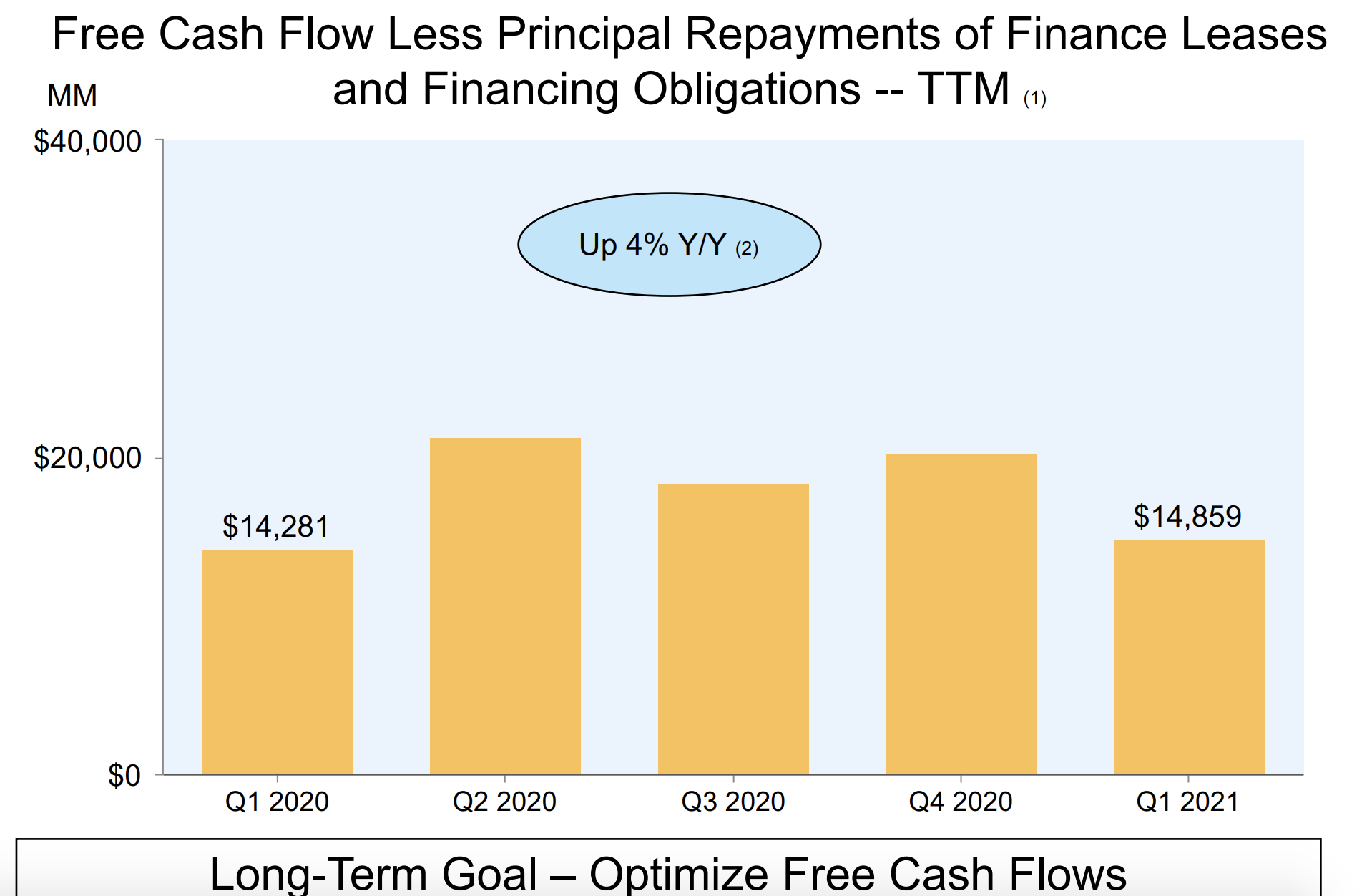 2021년 1분기에는 264억 불의 잉여현금이 있었고 전년 동분기에 243억 불의 잉여현금이 있던 것을 감안하면 전년대비 9% 상승한 수준입니다.