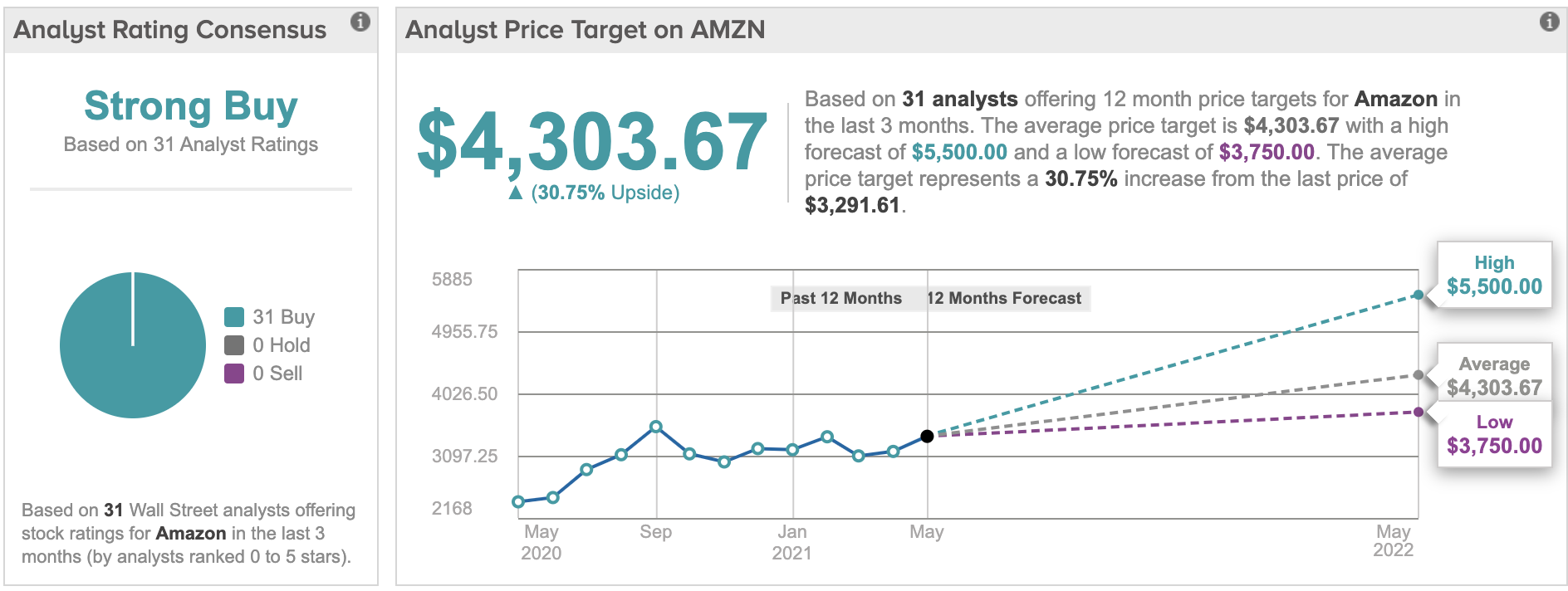 5월 9일 기준으로 아마존 주가는 3,292불이고, 31명의 애널리스트 전망으로는 31명 모두 매수 의견, 그들이 평가한 평균 주가는 4,303불입니다. 향후 12개월 추정치이므로 1년 내에 4,303불에 도달할 수 있다는 의미라고 보시면 됩니다. 애널리스트들이 100% 정답이라고 말할 수는 없지만 강력 매수 수준이면 혹 할 수 밖에 없긴 합니다^^;;