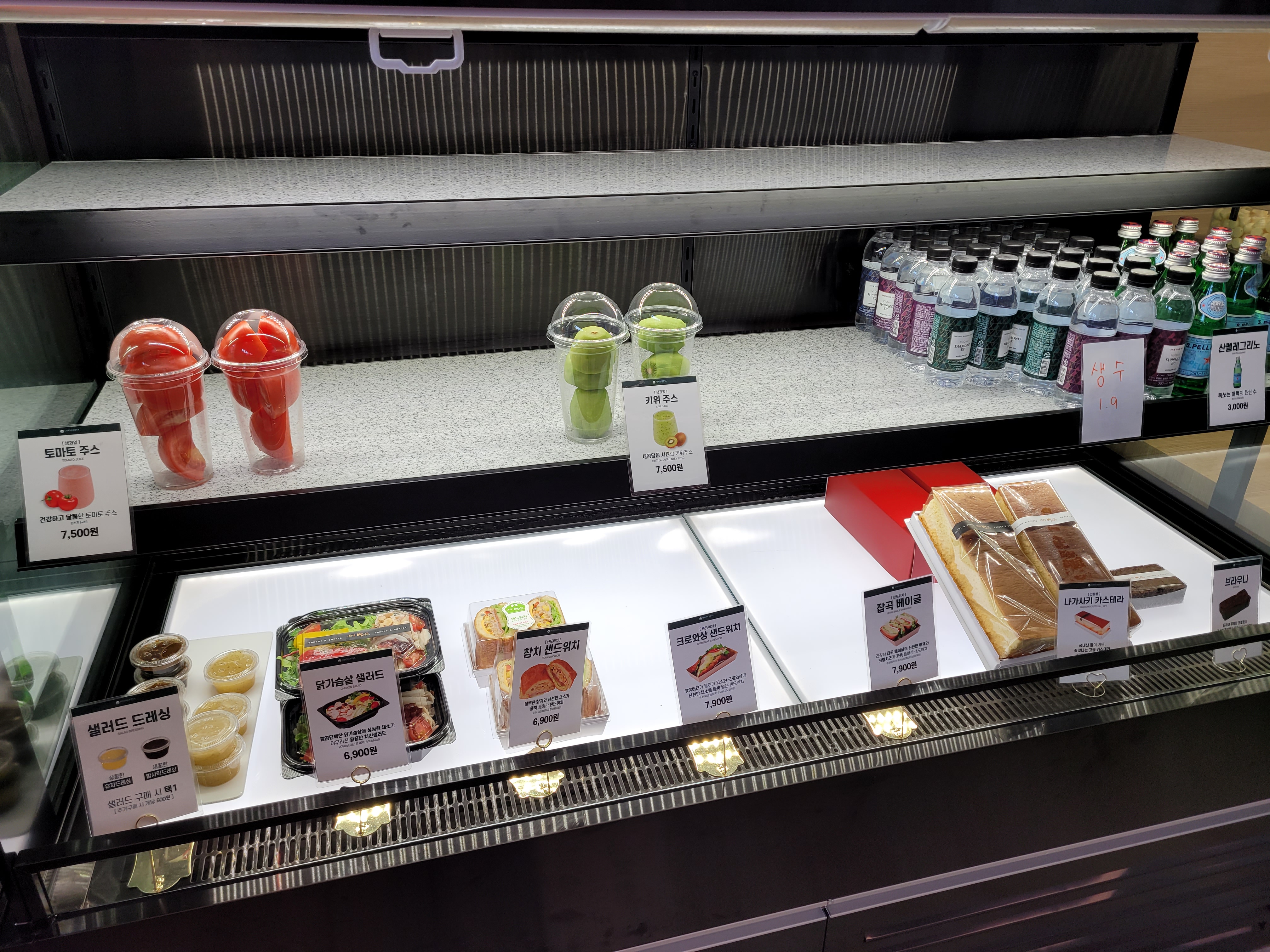 토마토 주스(7,500), 키위주스(75,00), 닭가슴살 샐러드(6,900), 참치 샌드위치(6,900), 크로와상 샌드위치(7,900), 잡곡 베이글(7,900)