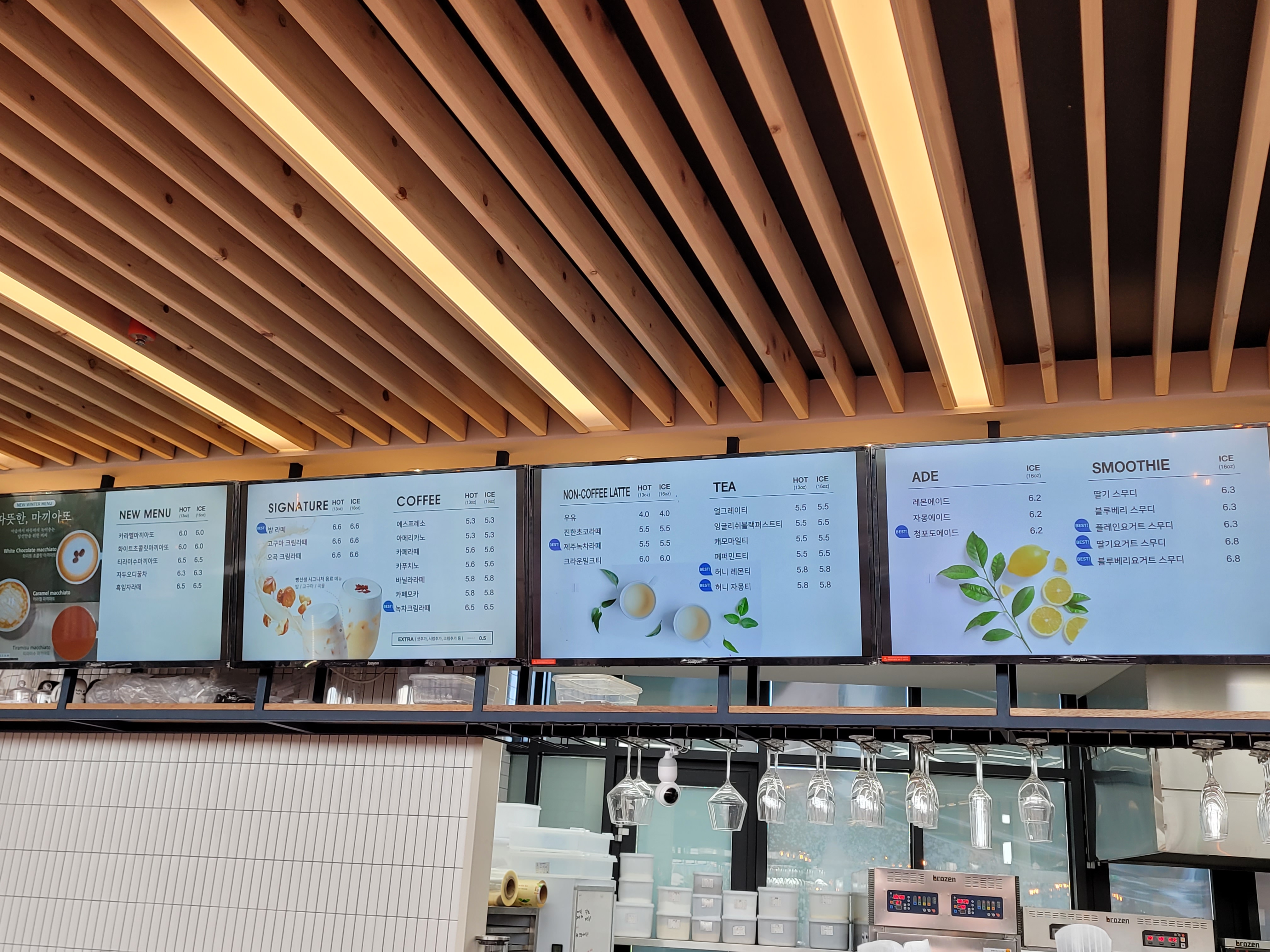 음료도 꽤나 다양합니다. 시그니처 메뉴인 밤 라떼, 고구마 크림라떼, 오곡 크림라떼부터 커피류, 차, 에이드, 스무디까지... 커피를 즐겨드시지 않는 분들도 빵과 함께 마실 음료가 있으니 이 점이 장점인 듯 싶습니다. 저는 아아를 좋아하지만 3시가 넘은 시점이라 캐모마일티를 주문했고, 달달구리 음료를 좋아하는 예랑이는 밤 라떼를 주문했어요!