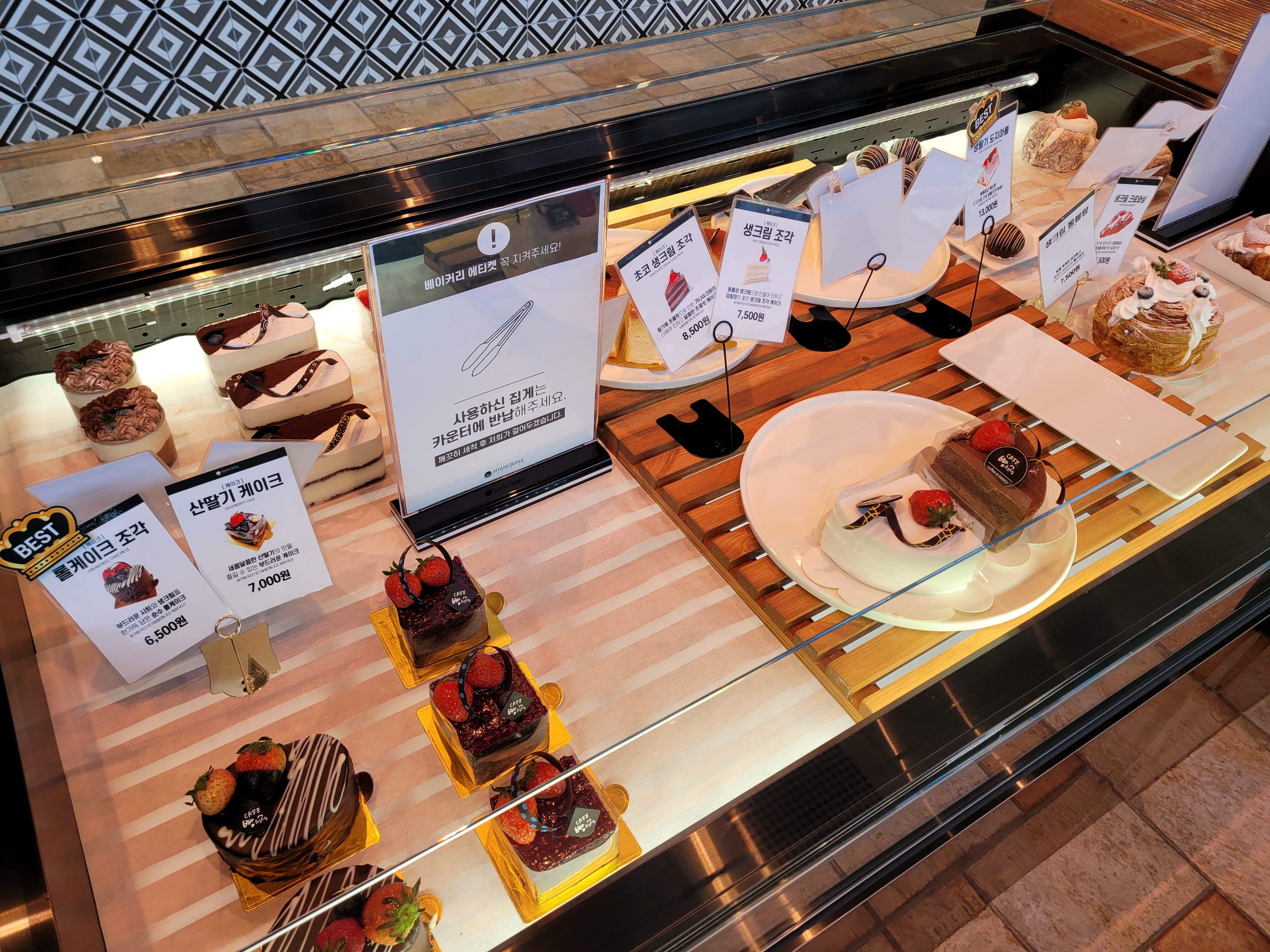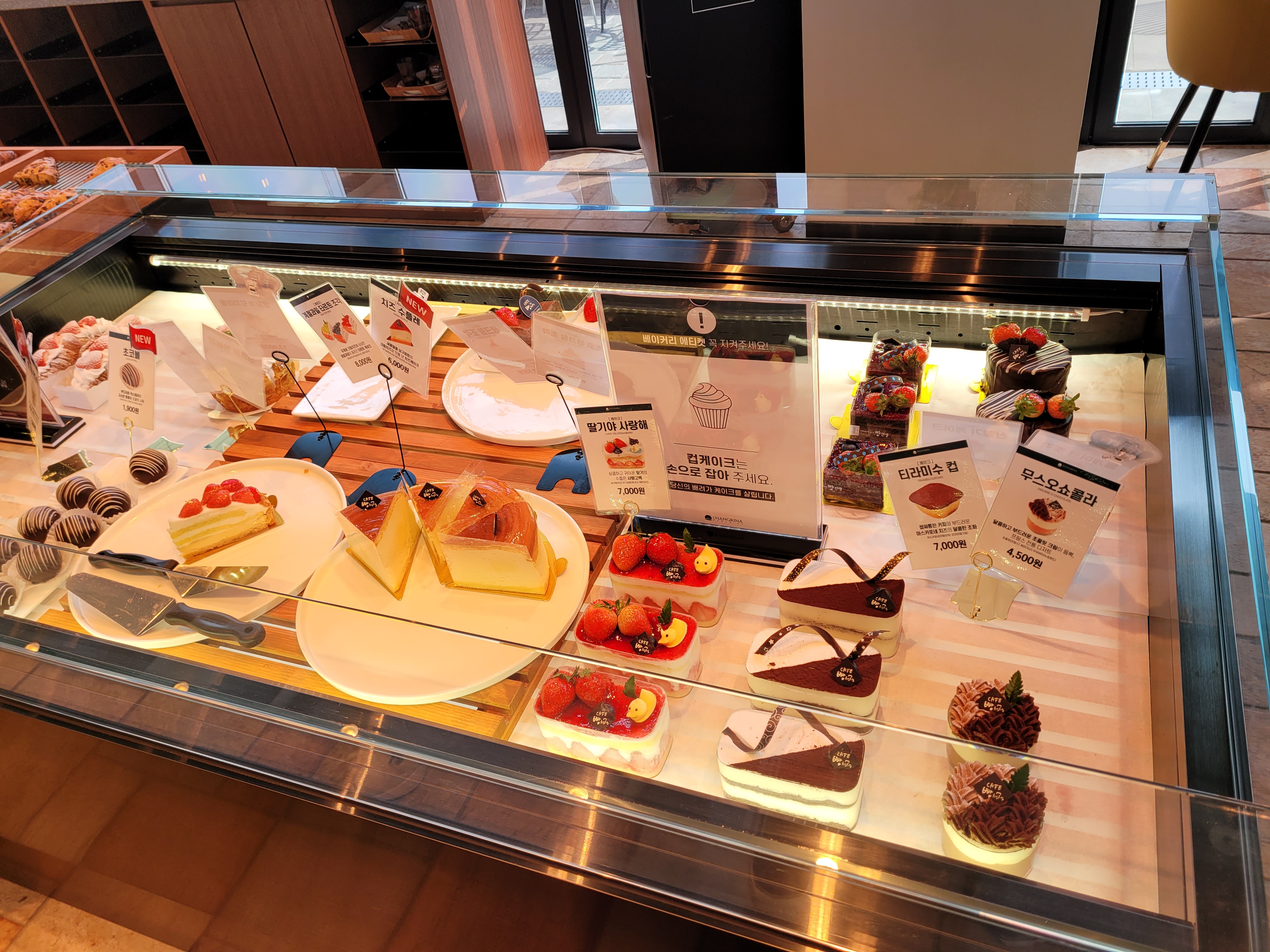 딸기야 사랑해(7,000), 티라미수 컵(7,000), 무스오쇼콜라(4,500), 치즈수플레(6,000), 계절과일 타르트 조각(8,000)