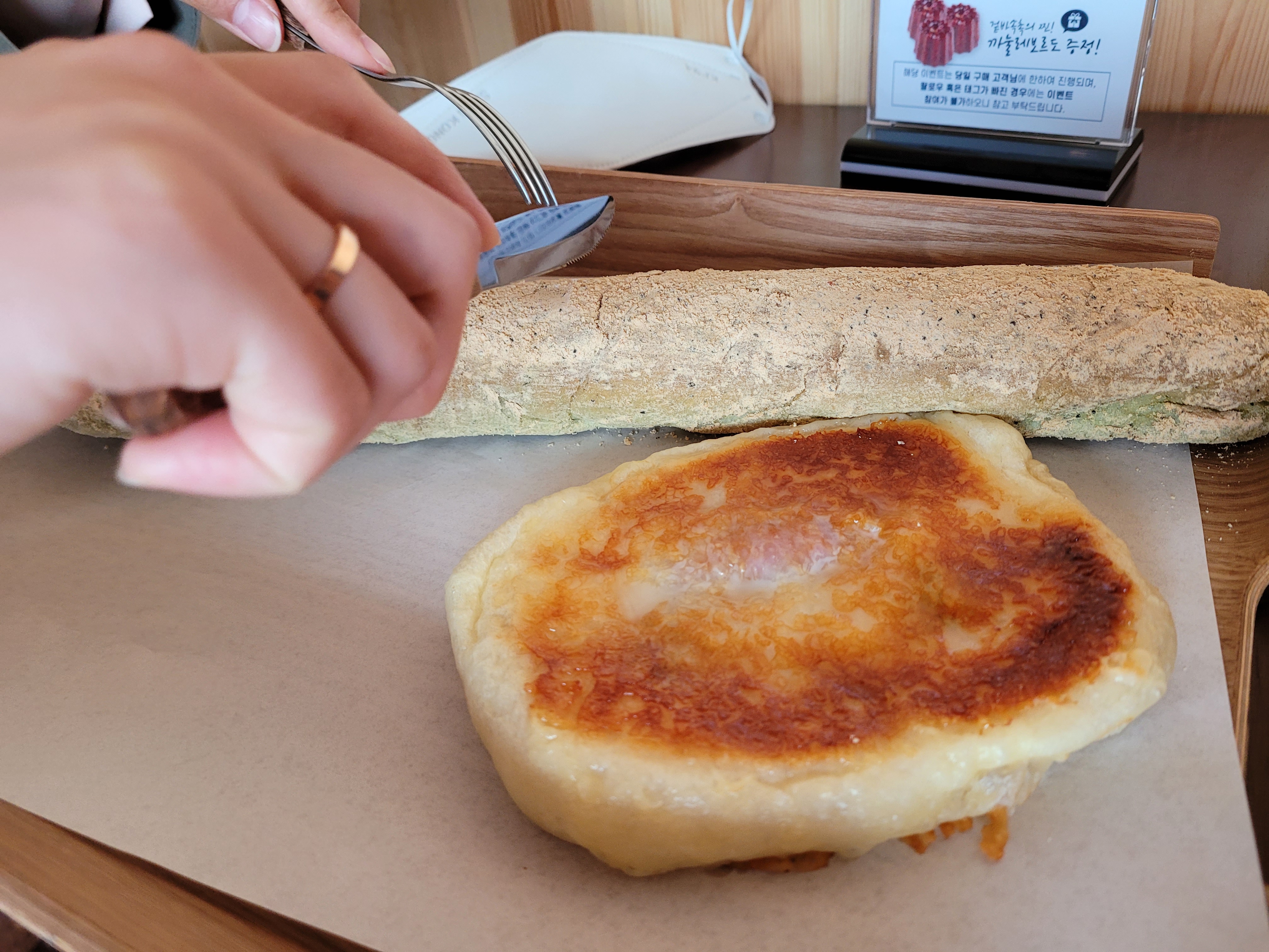 저희 커플은 치즈 납짝이와 쑥절미를 골랐어요. 단짠의 콜라보를 느끼기 위해 케이크를 포기하고 빵류를 선택해서 맛보았답니다. 빵고르는 데 시간이 얼마나 걸렸던지... 맛있어보이는 빵들이 너무나도 많았거든요. 쑥절미는 사실 강릉 만동제과에서 먹었던 카푸치노와 비슷한 비주얼이길래 그 맛이 그리워서 골랐는데,,, 후기는 아래에 적도록 하겠습니다!