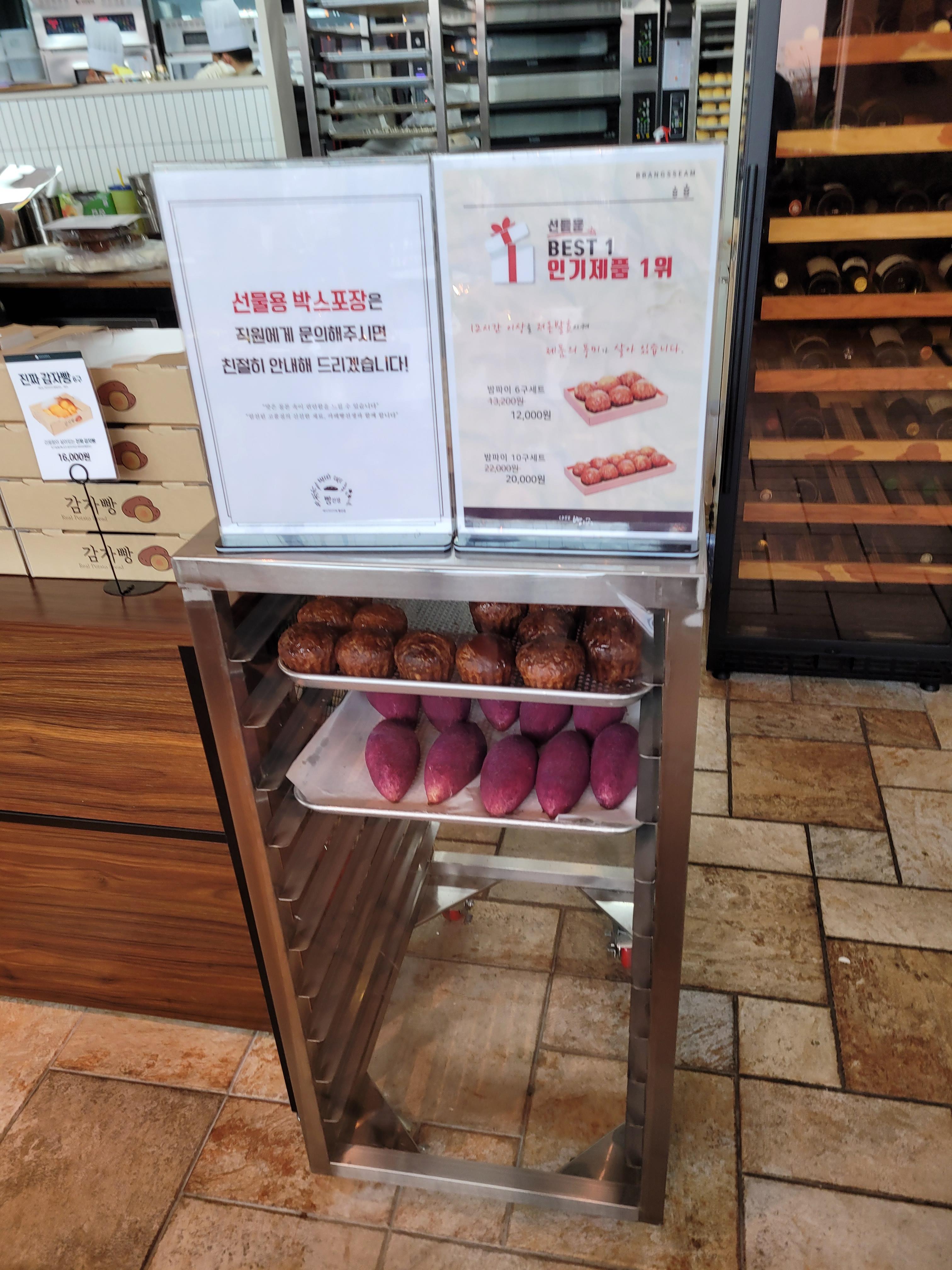 선물용으로 밤파이, 진짜 고구마빵, 진짜 감자빵을 포장해서 가져가시는 분들도 있는 듯 해요. 밤파이는 1개당 2,200원으로 머핀 모양처럼 생겨 맛있어 보이긴 했어요. 진짜 고구마빵, 감자빵은 진짜로 고구마 맛, 감자 맛이 날 것 같은 느낌입니다. 예전에 몽트리 베이커리에서 해남고구마빵을 먹었다가 진짜 고구마맛에 살짝 실망? 한 적이 있어서ㅋㅋㅋ 눈 길도 안줬습니다.