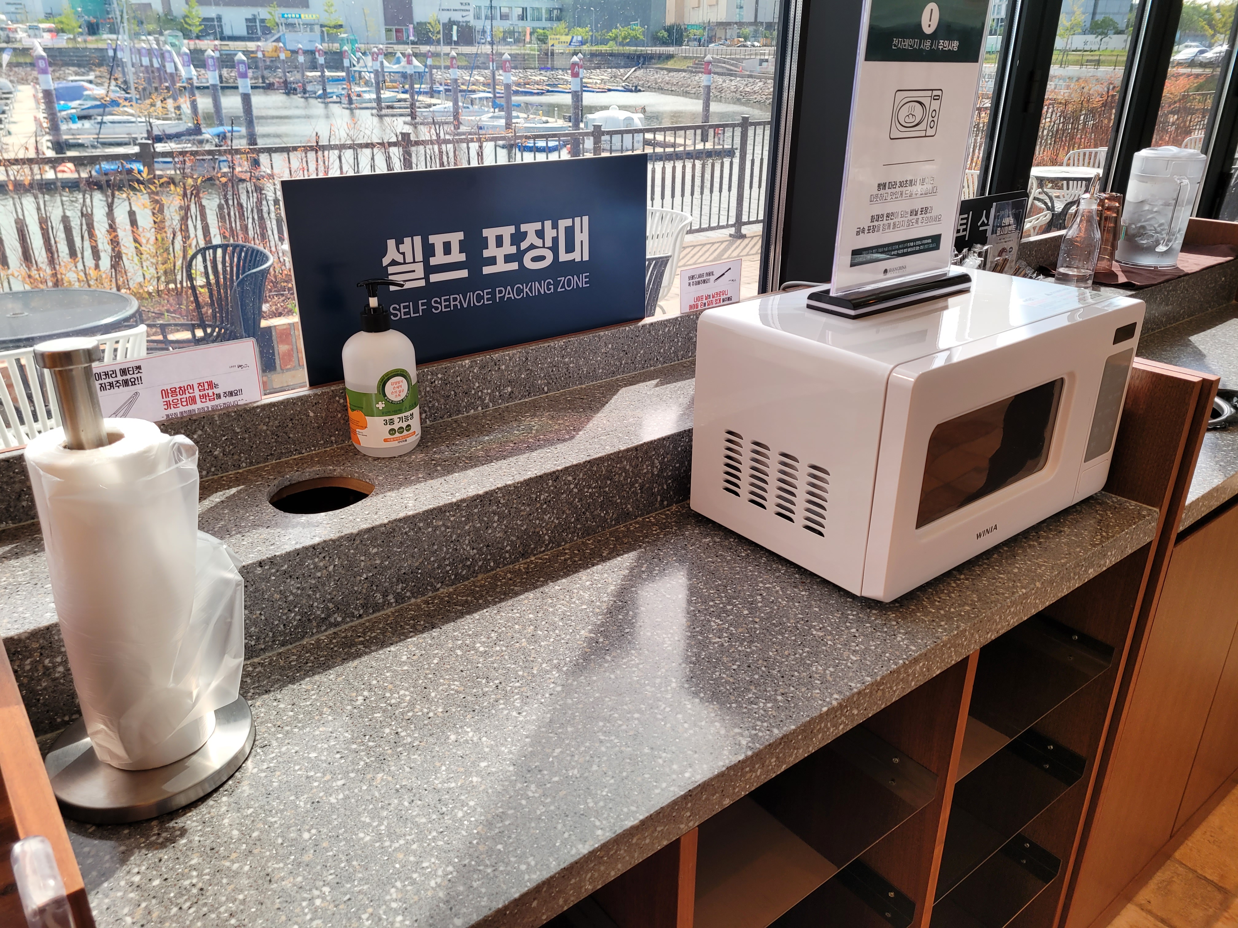 대형 베이커리 카페 답게 남은 빵을 직접 포장할 수 있도록 셀프 포장대도 있고요. 식은 빵을 데워먹을 수 있도록 전자레인지도 구비되어 있습니다.