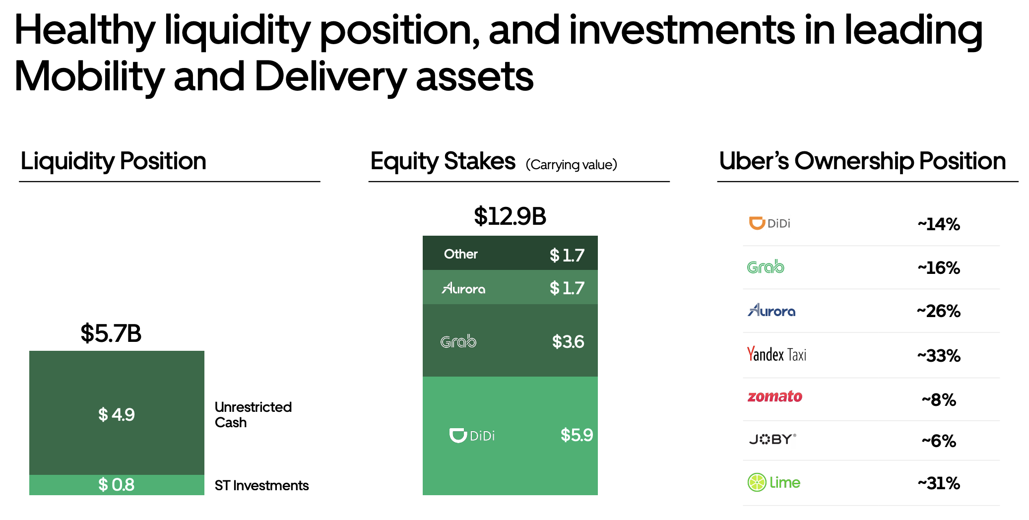 우버는 손정의를 등에 엎고 야심차게 상장한 기업답게 건강한 유동성을 가지고 있다고 합니다(우버 피셜). 사실 우버는 다른 공유경제 플랫폼과도 경쟁을 하고 있기 때문에 경쟁에서 밀려버리고 나면 끊임없이 뒤처질 수도 있는데요. 다행히 우버는 다른 공유경제 플랫폼의 지분을 소유하고 있습니다. 중국의 디디추싱, 동남아의 그랩 뿐만 아니라 aurora, yandex taxi까지... 우버에 투자하시면 전세계의 공유경제 플랫폼에 투자한다는 의미를 가질 수도 있습니다.