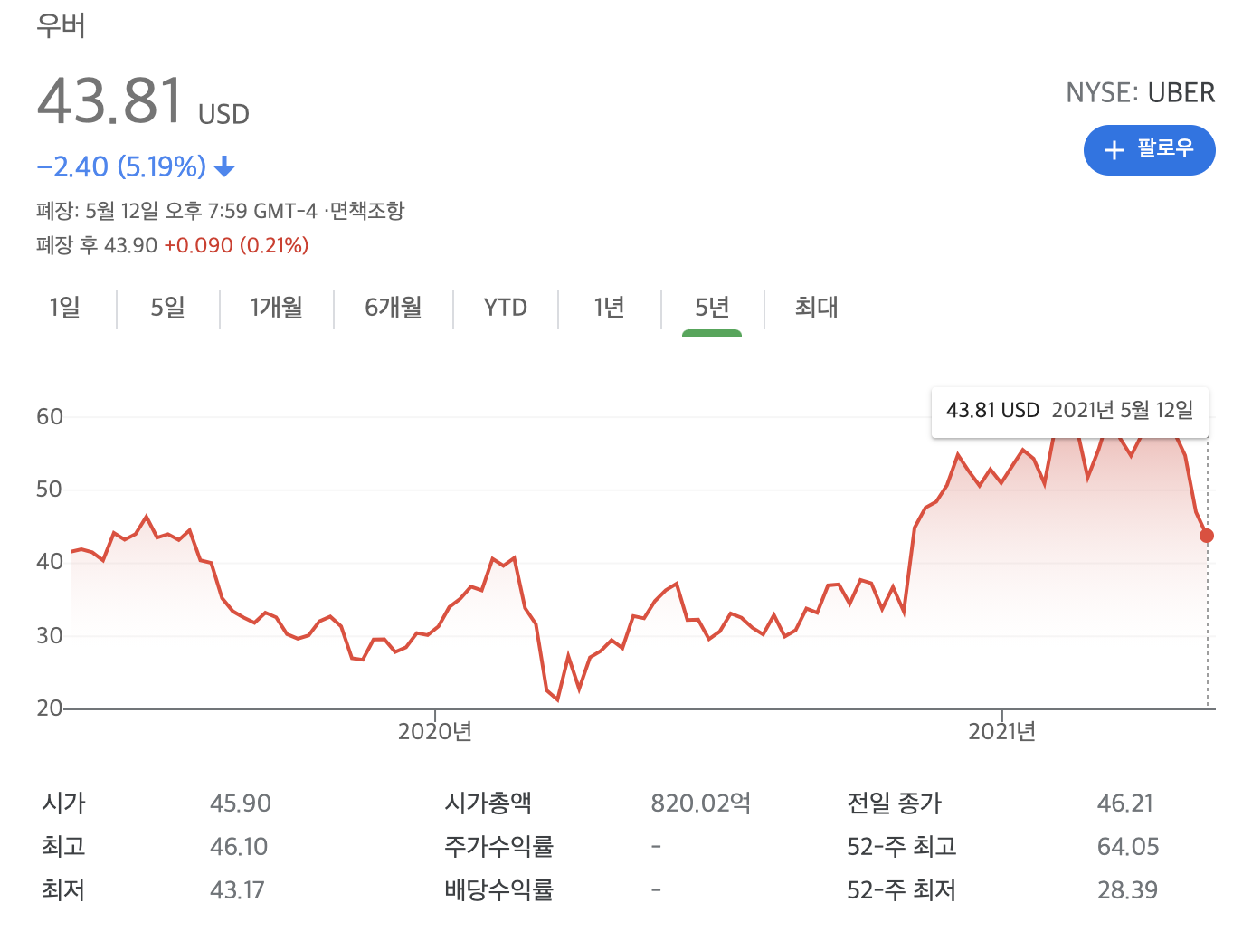 근 1-2개월 간, 기술주를 중심으로 나스닥 시장이 크게 조정받고 있는 것도 한몫할테고, 우버의 택시 기사나, 배달원들이 우버 소속의 직원으로 대우를 받아야한다는 미국 노동부의 언급도 한 몫 할 겁니다. 우버의 택시 기사, 배달원들에게 정규직원처럼 휴가나 보험을 보장해야 하니 그에 따른 비용 지출이 어마어마 하겠지요. 아직 적자를 면치 못하고 있는 우버에게는 노동부의 언급이 꽤나 부담스럽게 다가올 겁니다.