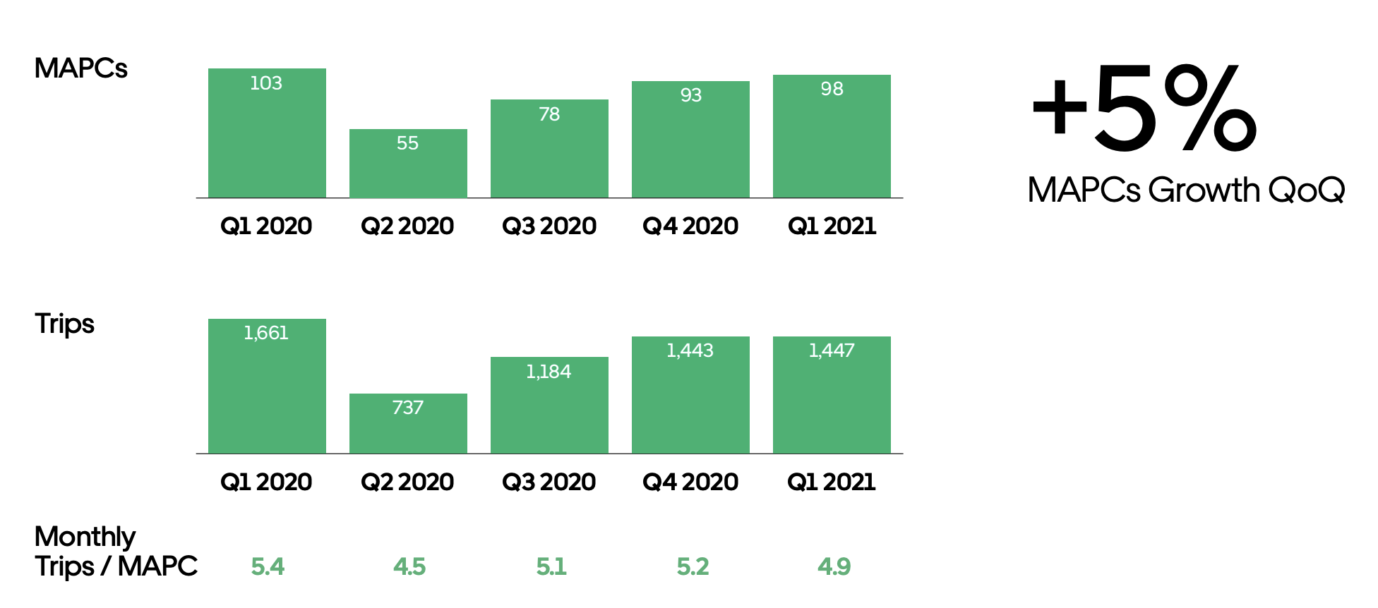 2021년 1분기의 MAPCs는 9800만 명으로 전년 동분기에 1억 3백만 명에는 미치지 못하는 숫자입니다. 대신 지난 분기 대비하며 5% 상승한 수치를 보이고 있습니다. Trips는 14억 4700만 개로 한 명이 평균적으로 1달에 4.9번은 사용한 셈이라고 보시면 됩니다. 배달이든 모빌리티든 1달에 우버를 5번 이용하였다면 1주에 한 번은 우버를 이용했다고 보셔도 됩니다. 이 때문에 월별 Trips/MAPC를 보시면 고객의 충성도를 의미한다고 해석할 수 있습니다.