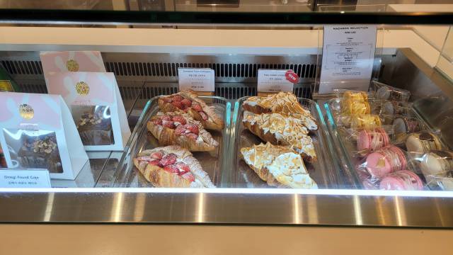 진열대 왼쪽에는 오메기 파운드 케이크, 오른쪽에는 크림 크로와상과 마카롱이 있는데 비주얼 폭발 아닌가요.. 저는 헬퍼님과 작가님 드리려는 요량으로 오메기 파운드 케이크와 샌드위치를 구매했는데 오메기 파운드 케이크가 포장이 정갈해서 만족스러웠습니다. 헬퍼님 왈, 실제로 맛도 있었다고 해요.