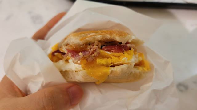 바나나와 에그베이컨머핀입니다. 에그베이컨머핀의 달걀이 완숙이 아니라 반숙인 덕분에 촉~촉한 식감을 자랑했고요. 맥모닝보다 건강한 맛이었어요. 잉글리시 머핀도 따뜻하고 퐁신한 식감에 아침식사로 제격이었어요. 다만 양은 부족하다는 점! 아마 점심, 저녁에 배부르게 드시려면 브렉퍼스트 트레이 세트가 좋겠지만 그래도 더 든든하게 드시려면 빵을 더 드시는 게 좋습니다.