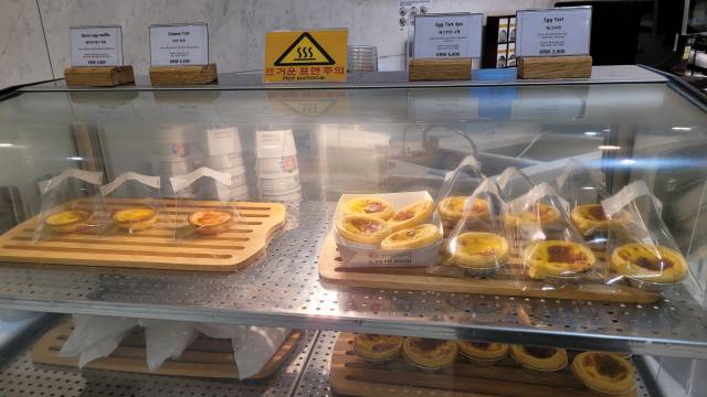 카운터 쪽에는 따끈따끈해보이는 에그타르트도 있고, 왼쪽 하단 트레이를 살펴보시면 브런치용 에그 베이컨 머핀이 있습니다. 조합이 맥모닝세트와 비슷했기에 배를 좀 더 채우기 위해 아침식사용으로 빵을 더 구매하기로 했어요.