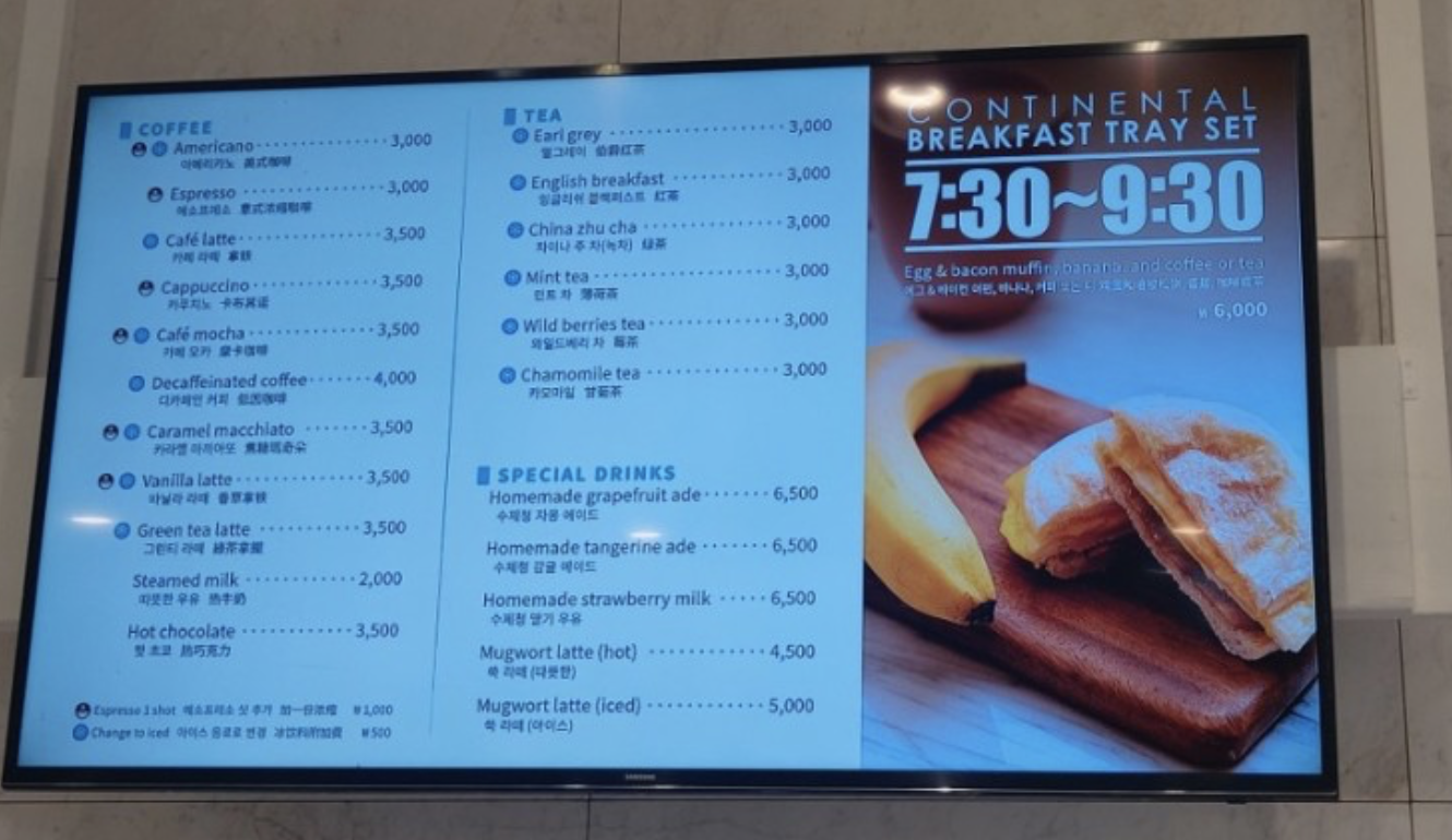 저희는 애초에 7시 30분부터 9시 30분까지만 즐길 수 있는 아침세트를 먹으려고 방문했는데요. 에그-베이컨 머핀, 바나나, 커피 or 차 조합에 6,000원이라는 합리적인 가격이 매력적이죠.