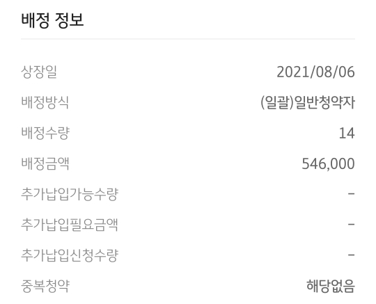 요즘 많은 분들이 공모주 경쟁률이 심해 큰 돈을 넣어봤자 배정되는 청약 수량이 많지 않은 추세인데요. 투자금 대비 수익률만 따진다면(공모주가 +수익률일 경우,) 최소 물량인 10주만 넣으시는게 이득이긴 합니다. 최소 청약 금액의 100배 이상의 금액을 넣었음에도 배정받은 수량은 3배도 되지 않습니다...ㅎㅎㅎ