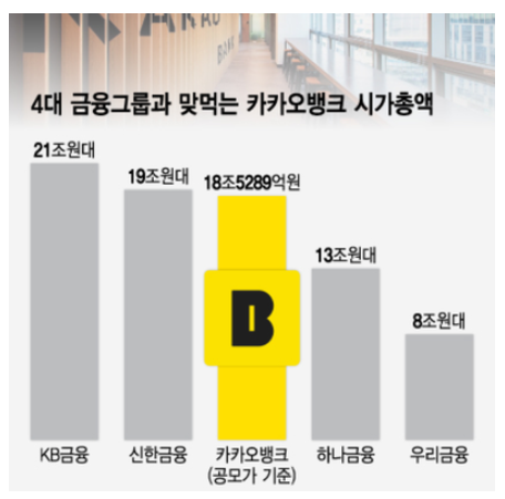 카카오뱅크의 시가총액이 4대 금융그룹과 맞먹는다는 사실이 사람들이 주저할 만한 이유가 아닐까 싶습니다.