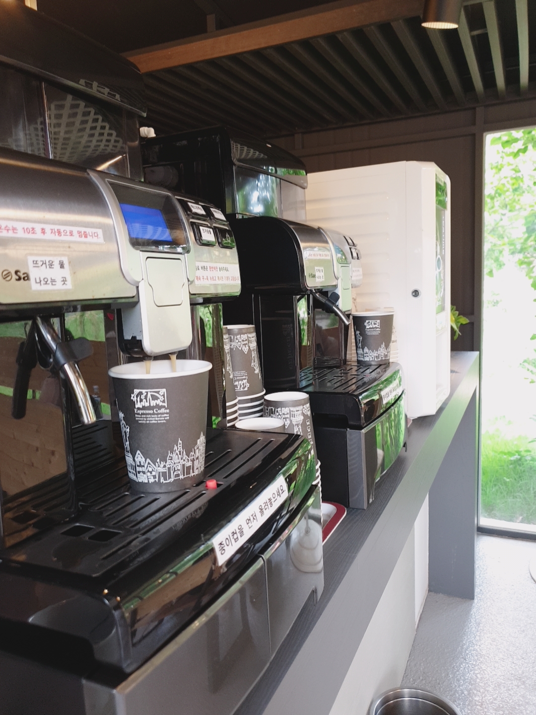 쉼터 안에는 커피 머신이 있어서 셀프로 부담없이 마실 수 있었어요. 에어컨도 시원하게 틀어놓으셔서 앉아있기 쾌적했답니다. 사실 아이스로는 마실 수 없어서 조금 아쉬운 면이 있었는데 앉아있으니 직원 분이 얼음냉장고를 설치하시더라구요~ 아마 곧 아이스로도 마실 수 있을 듯 합니다.