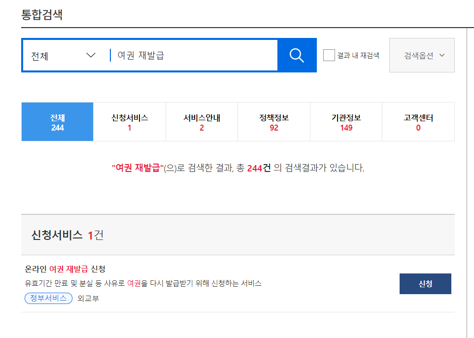 우선 검색창에 `여권 재발급'이라고 입력하면 신청서비스 카테고리에 온라인 여권 재발급 신청 칸이 현시됩니다. 이쯤에서 눈치채시는 분들도 있으실텐데 여권 신규발급은 직접 구청 방문해서 하셔야 하고, 정부24에서는 여권 재발급 업무만 가능하다는 점!!!재발급도 만19세 이상의 성인만 가능하다고 해요.