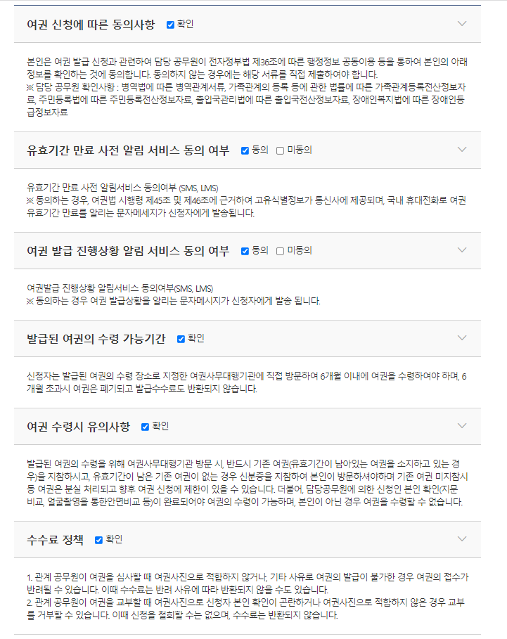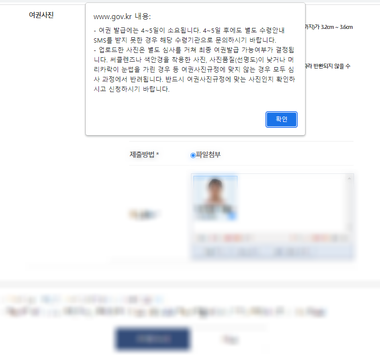 여권 신청 관련 유의사항들을 모두 읽어보시고 확인 버튼을 클릭해줍니다. 여권 접수가 반려될 경우 수수료가 반환되지 않는다고 하니 이 점 유의해주세요. 저는 사진관에서 찍은 사진이 아니다보니 수수료 정책이 조금 신경쓰이긴 했습니다.