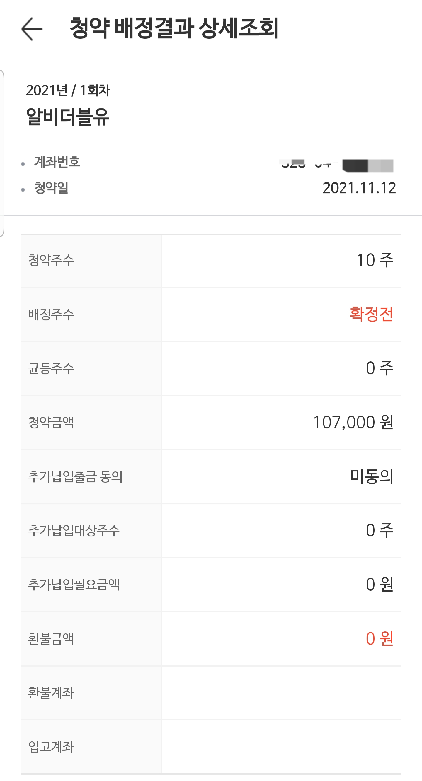 그래도 요즘 균등청약 운이 좋다보니 30%의 확률로 받을 수 있지 않을까 내심 기대했는데 결과는 0주였습니다.
