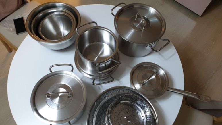 스텐 제품 세척을 위해 식탁에 모두 펼쳐놓았는데, 시계방향으로 5시, 11시 제품을 제외한 5종이 휘슬러 오리지널 냄비 컬렉션입니다. 해외 배송이었지만 배송 속도도 빠르고, 제품 상태도 매우매우 만족스러웠어요.