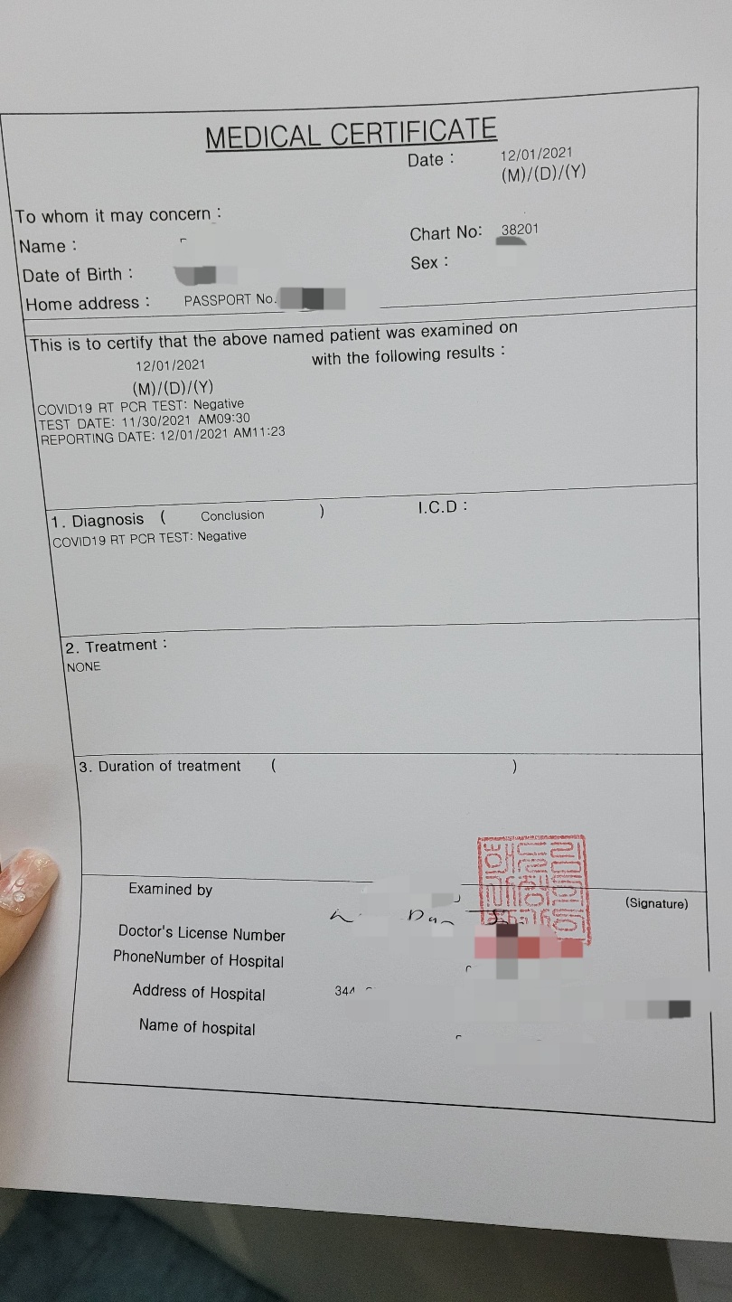 저희 앞에도 음성확인서를 발급받으러 오시는 분이 있으시더라고요. 일반 진료 받는 것처럼 대기를 하고 진료실에 들어갔습니다. 의사분께 지참한 여권을 보여드렸고 음성확인서를 발급받았어요. 여권번호와 발급 시간, 검사 체취 시간 등 꼭 필요한 부분이 기재되어 있는지 검토했고요. 생년월일 등 틀린 부분이 없는지 확인 했어요.