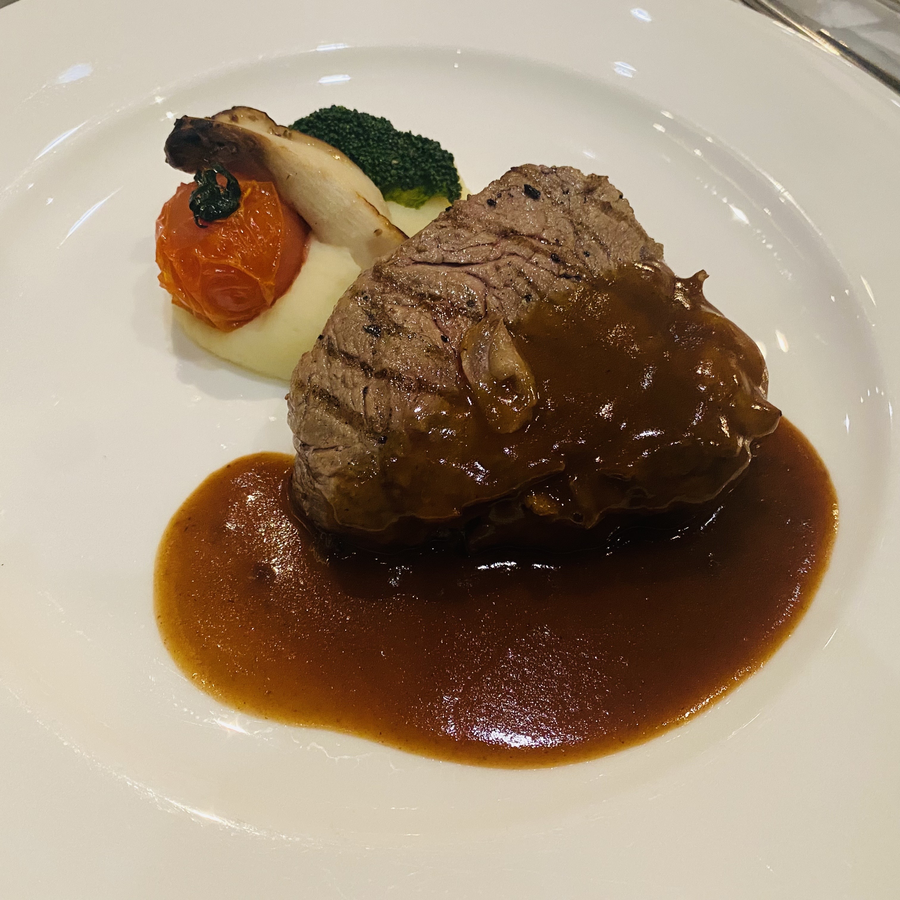 매쉬드포테이토, 구운 야채, 한우 스테이크가 나왔어요. 의외로 스테이크 크기가 커서 만족스럽고 고기 퀄리티도 꽤나 우수했어요. 굽기 정도를 정할 수 있는지는 모르겠지만 미디엄 웰던~웰던 사이의 굽기 정도라서 부담없이 먹을 수 있었어요. 어르신 분들도 드시기 적당한 수준이었습니다.