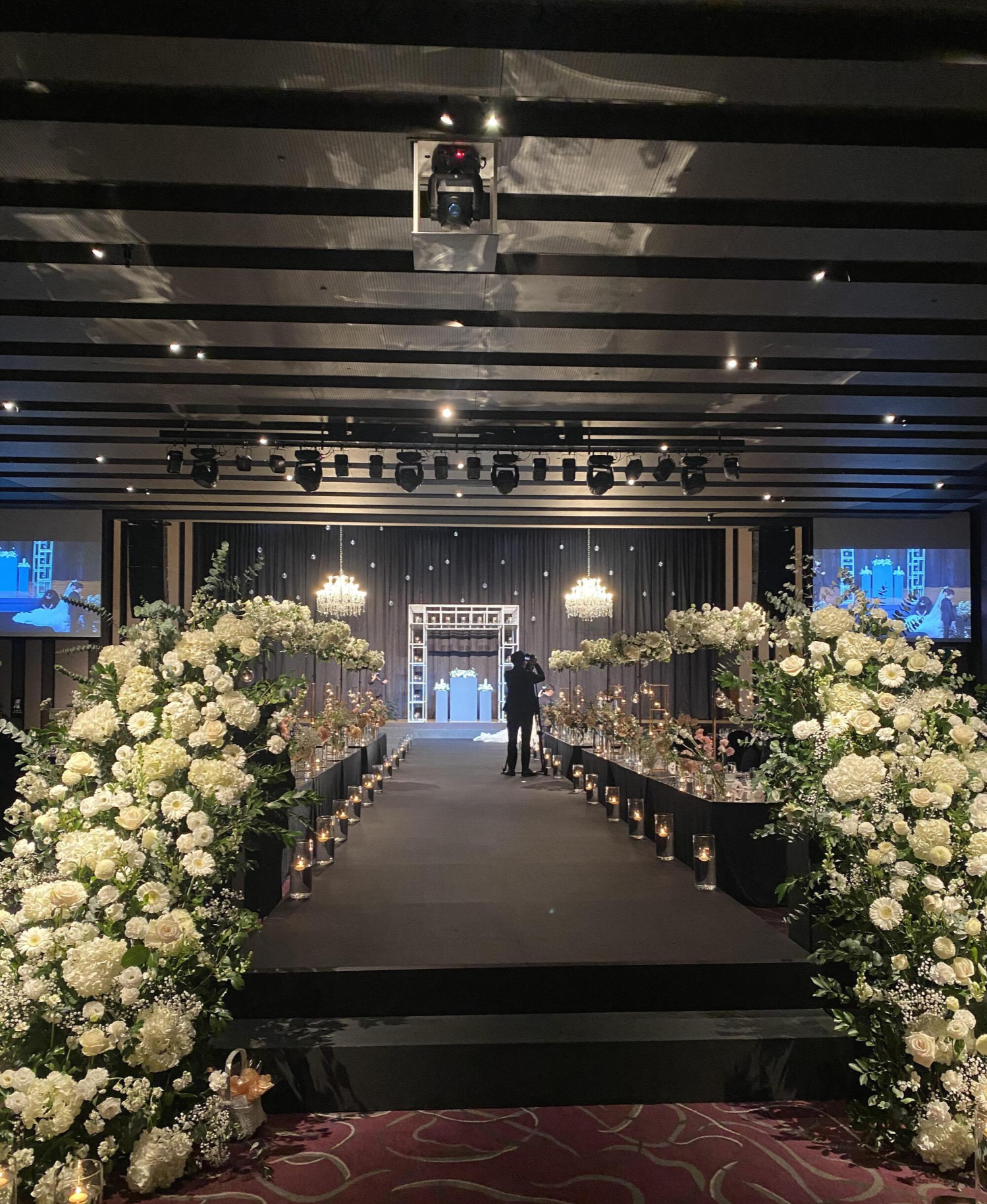 홀은 실물이 훨씬 예쁜데 사진으로는 잘 안 담기네요. 꽃 장식도 굉장히 풍성했고, 화이트앤 그린이라 깔끔하기도 했어요. 꽃 장식은 커스텀이 가능해서 컬러감있는 꽃으로도 가능한 걸로 알고 있어요. 금액 추가가 있긴 하겠지만요.
