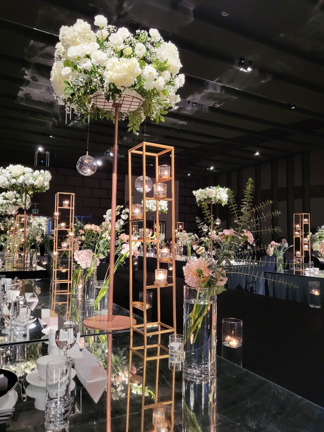 식장 내부에는 1자형 테이블과, 원형 테이블이 있었는데 원형 테이블에는 보통 가족이나 부모님 지인분들, 1자형 테이블은 친구들이 차지하는 듯 했어요. 아마 1자형 테이블이 버진로드에 붙어있으니 사진을 예쁘게 찍기에는 친구 하객이 짱이죠ㅎㅎ 화병에 꽂혀져 있는 꽃들 포함해서 식장 내부 꽃은 모두 생화여서 하객들이 귀가 시에 가져갈 수 있어요.