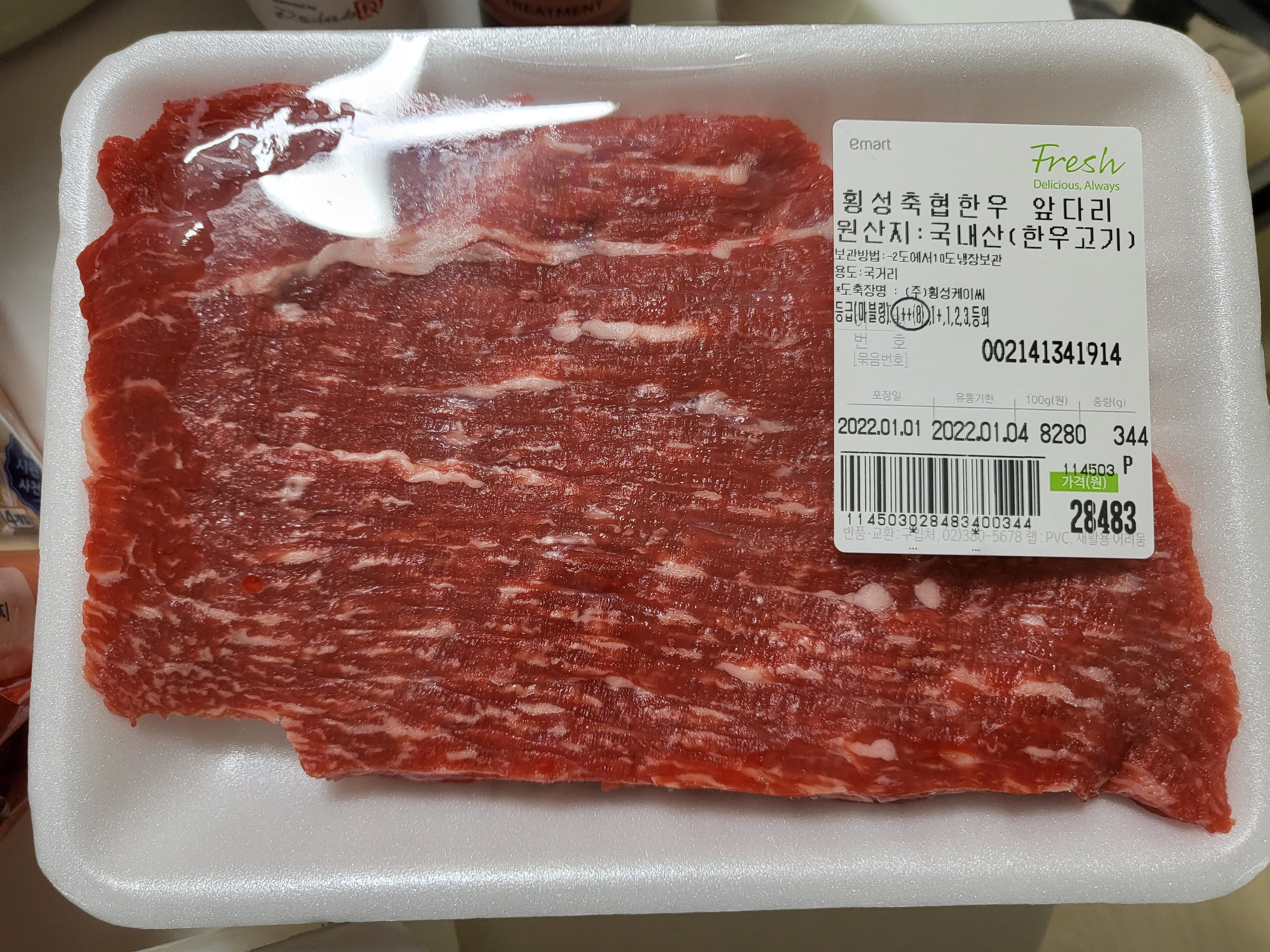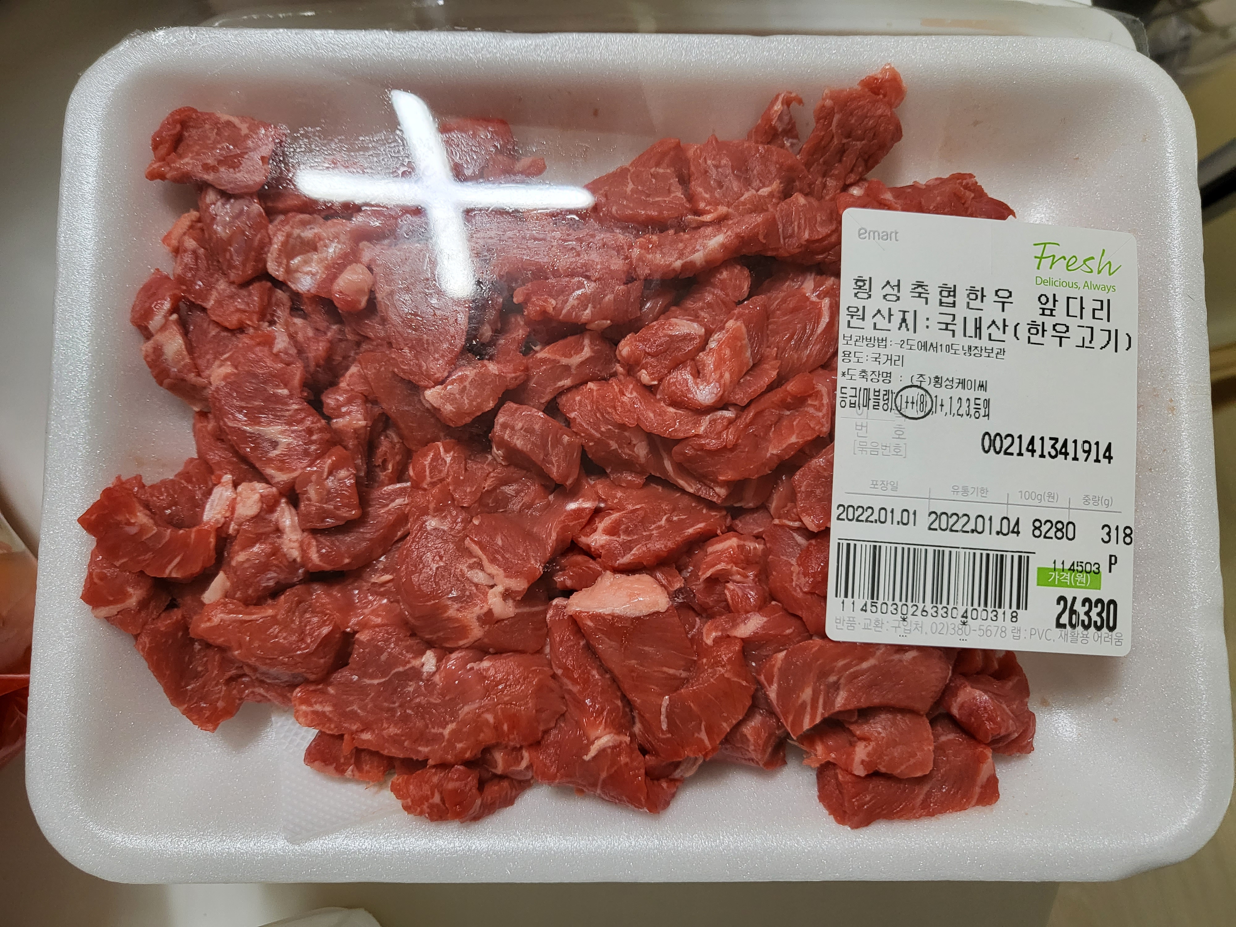 저희는 이마트 수서점에 다녀왔는데 확실히 이마트 양재점보다 한산하더라고요. 거의 10시 늦은 시간에 가서 그런지 품절된 상품들이 있더라고요. 1월 1일 행사였던 애플 망고 3입 12,800원 행사 상품은 한, 두개 밖에 없었습니다. 저희는 일단 떡국용 고기와 장조림용 고기를 구매하러 한우 코너로 직진했습니다.