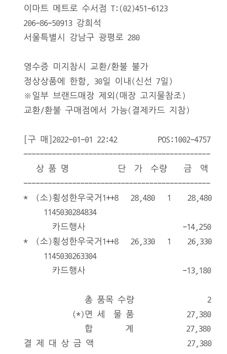 한우는 카드결제 40%에 국민카드 추가 10%라고 해서 반 값은 아닌 줄 알았는데 영수증 살펴보니 반 값이네요. 이마트 온라인앱에서도 한우 40% 행사를 하는데 횡성한우는 아니더라고요. 저희 친정 엄마는 이마트앱에서 한우 국거리, 불고기를 사셨다는데 저보고 잘 산 것 같다며 맛있게 먹으라고 하시네요ㅎㅎ