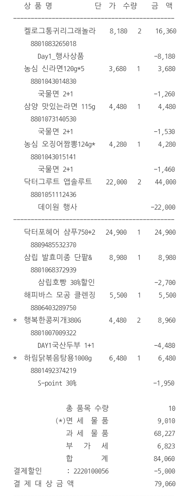 생각치도 못한 제품들을 이것저것 구매했네요....아무래도 샴푸, 린스, 클렌징폼이 차지하는 비중이 큽니다. 행사제품 위주로 사긴 했는데 요즘 물가가 오르긴 했나봅니다. 이마트 앱에서 DAY1 행사로 5만원 이상 5,000원 할인 쿠폰, 10만원 이상 1만원 할인 쿠폰을 주기 때문에 이용하셔서 할인 받으시면 됩니다.