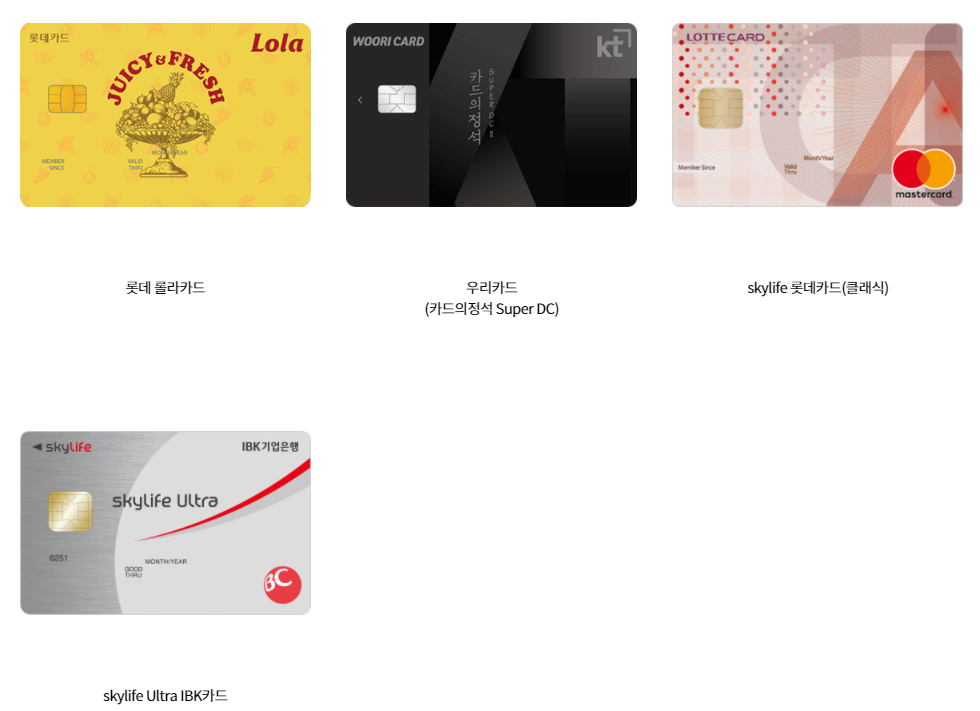 스카이라이프가 KT의 자회사라서 그런지 KT 청구 할인이 가능한 제휴카드도 스카이라이프에 적용 가능하더라고요. 일단 롯데 롤라카드, 우리카드 카드의정석 SUPER DC카드, 스카이라이프 롯데카드, 스카이라이프 Ultra IBK카드가 있습니다. 청구 할인 카드의 종류는 다양하니 소비금액에 따라 선택하셔도 되고, 상품권 구입을 통해 아파트 관리비를 납부하시려면 상품권 실적 가능 카드인지도 살펴보시면 좋습니다.