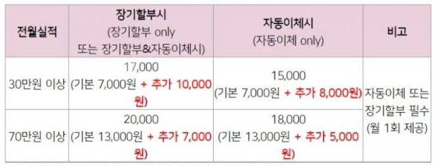 skylife 요금할인 최대 2만원 전월 이용실적 40만원 이상 1만원, 80만원 이상 1.5만원, 120만원 이상 2만원 할인 |