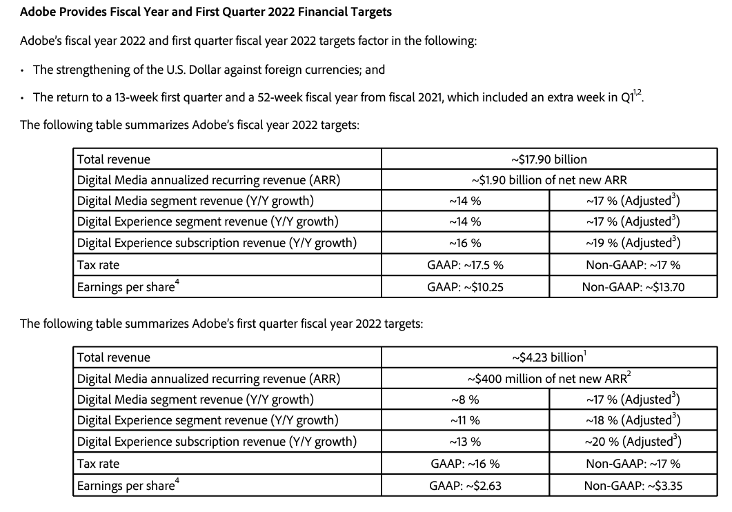 어도비에서 발표한 가이던스 자료입니다. 2022년 1분기에는 매출이 42억 달러라는 가이던스를 제시하였고 연간 성장률은 세그먼트에 따라 다르지만 약 8%에서 13%입니다. 2022년 전체 매출은 179억 달러라는 가이던스를 제시하였는데요.