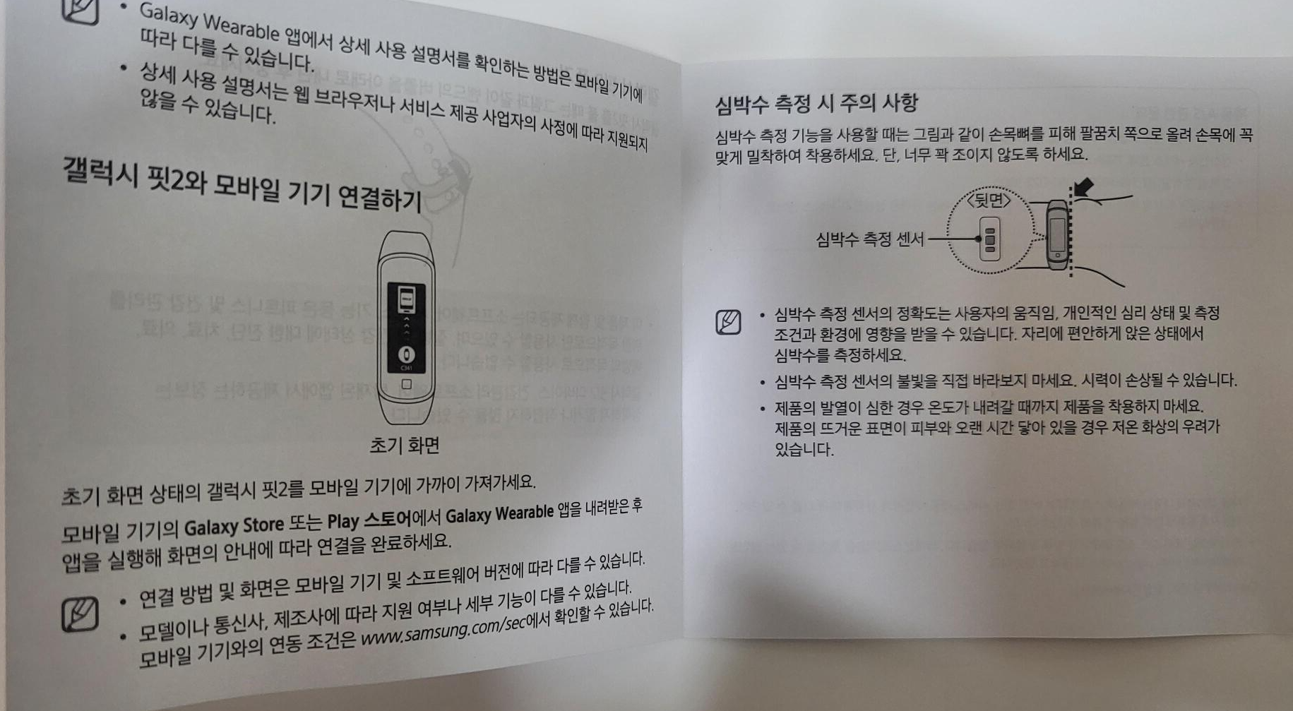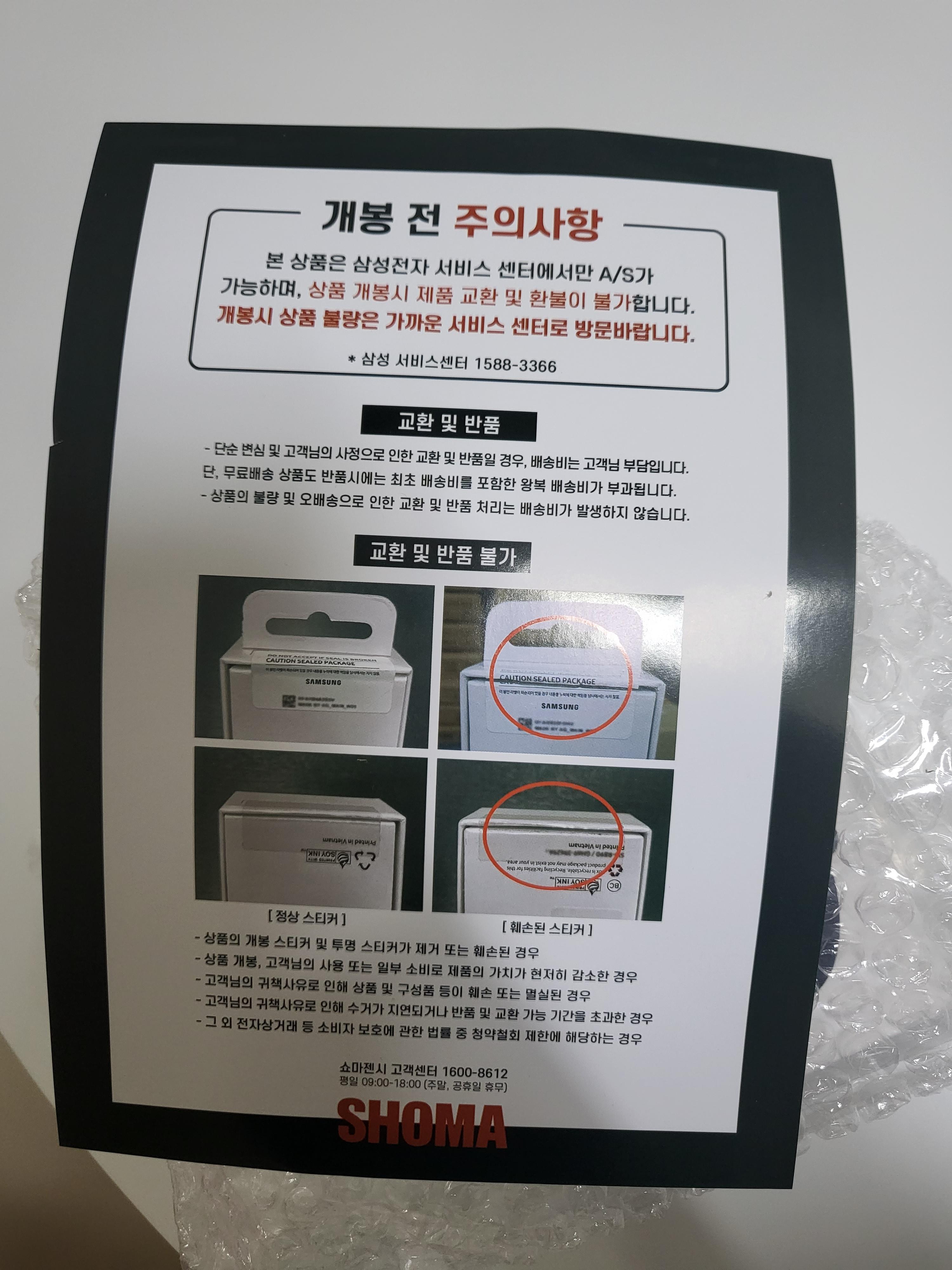 배송 지연 소식 문자를 받았는데 의외로 주문 후 3일 이내에 배송이 되었습니다. 택배를 얼어보니 개봉 전 주의사항 안내문이 있었고요. 상품 개봉시 제품 교환 및 환불이 불가하고 개봉시 상품 불량은 가까운 서비스 센터로 방문하라는 내용이었습니다. 개봉시 상품 불량이 교환이 안된다는 게 사실 의아하긴 했지만 다른 판매처도 그런 모양입니다. 불량 없는 갤럭시 핏이 왔길 바라며 상자를 살펴보았어요.