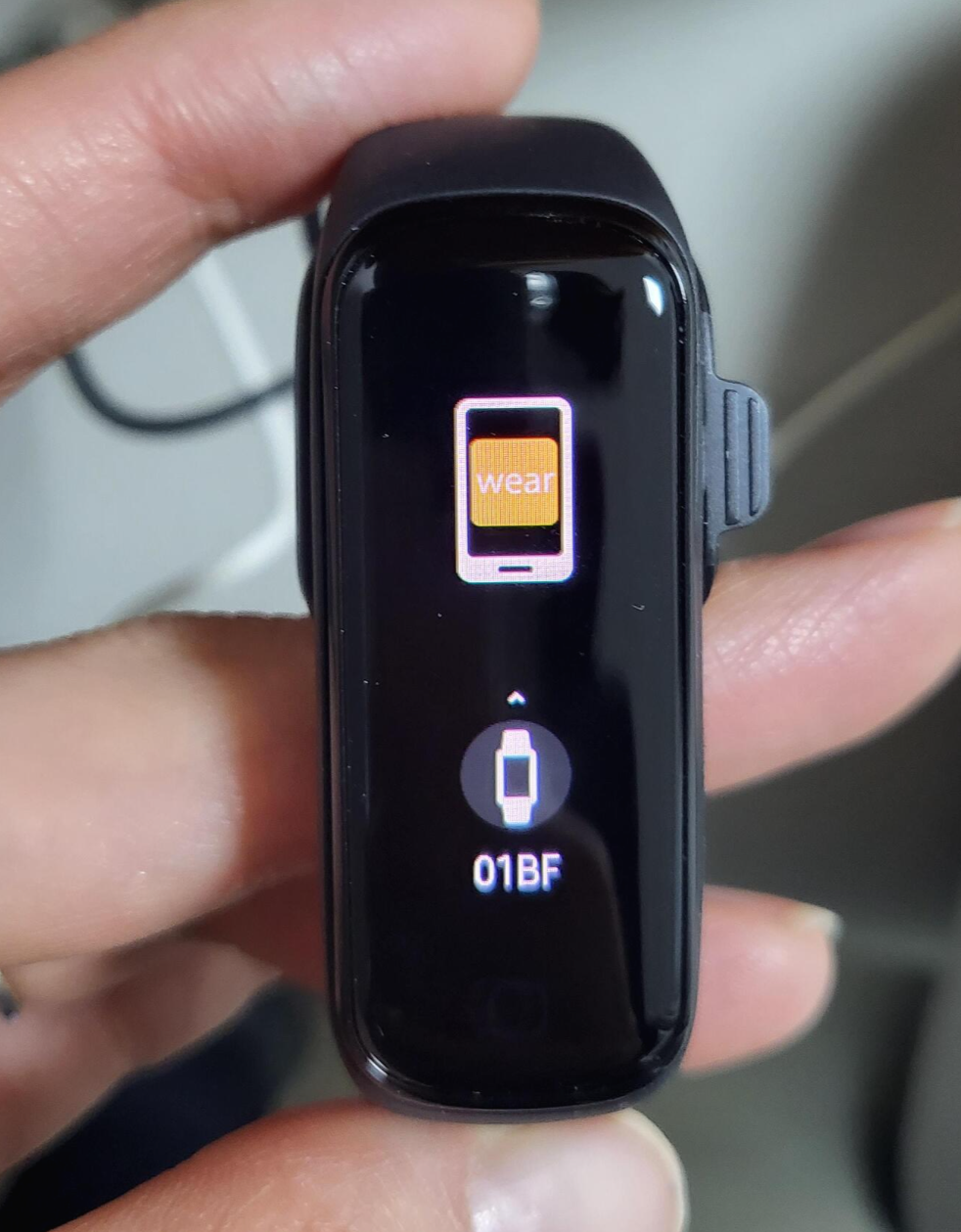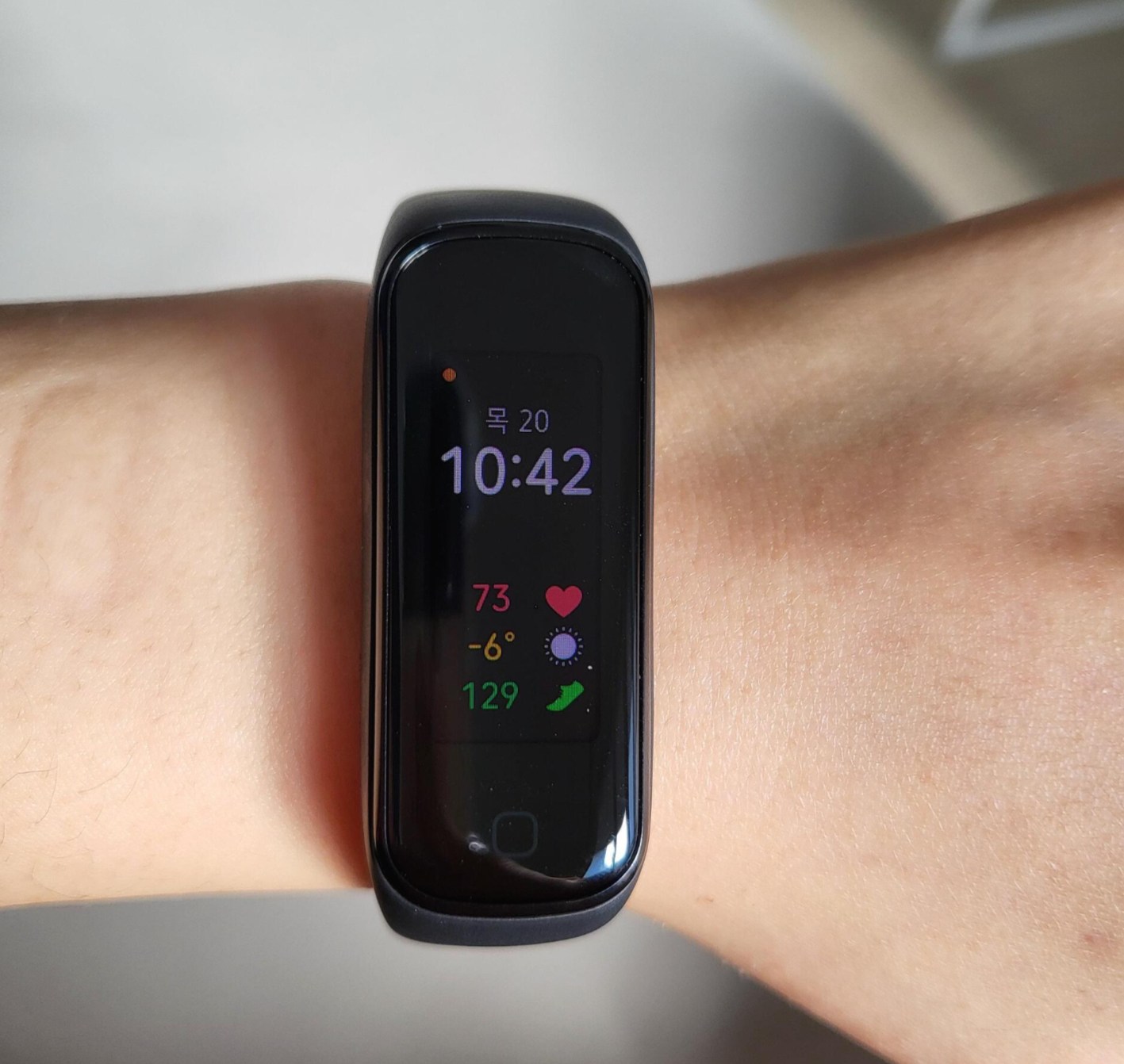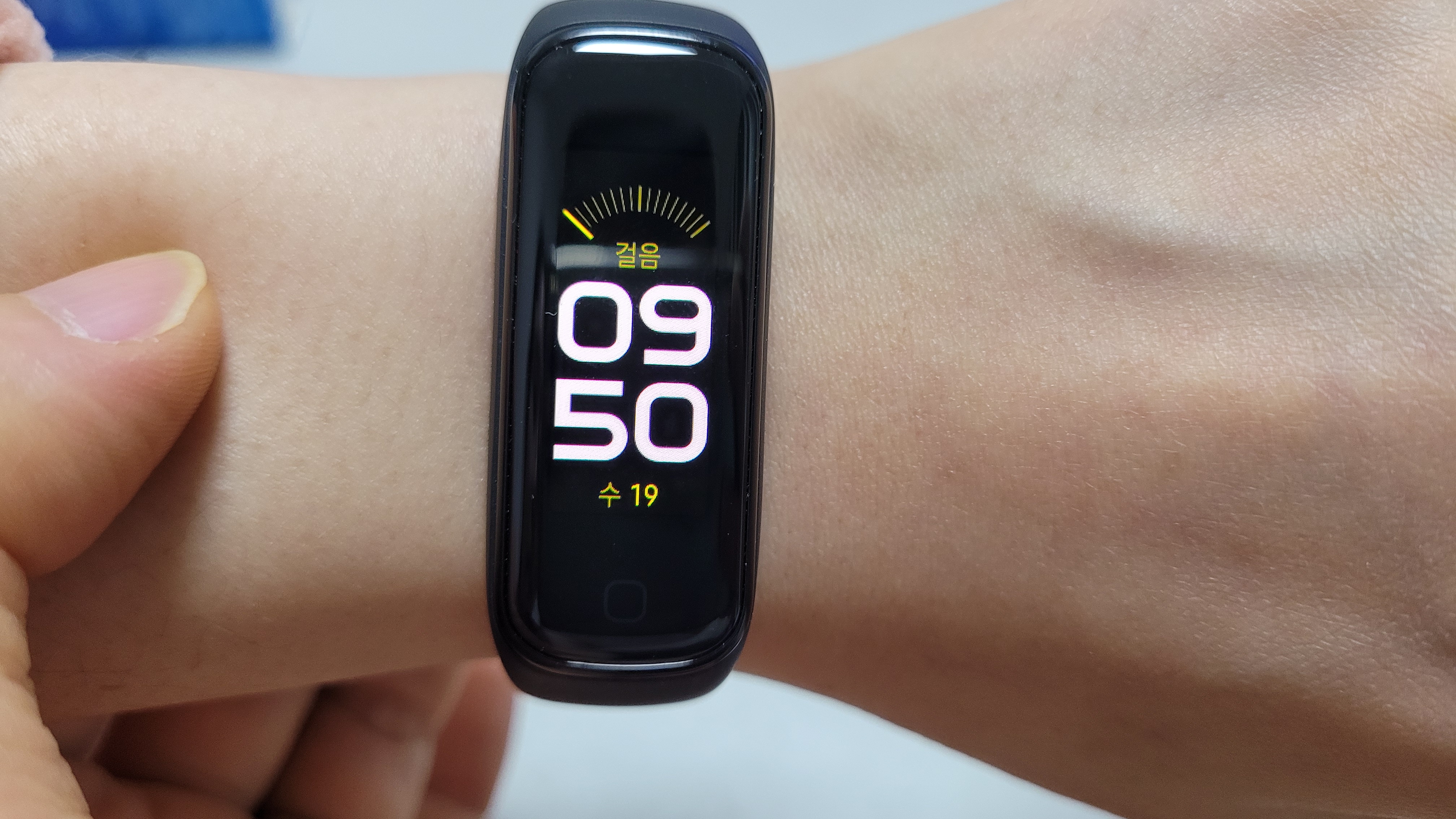 시간은 1분도 걸리지 않았습니다. 연동할 데이터가 그렇게 많지 않아서 그런걸까요? 이제 화면을 켜야하는데 처음에는 어떻게 화면을 켜야하는지 몰랐어요. 화면 하단을 자세히 보시면 희미하게 정사각형 모양이 있는데 그 정사각형을 누르면 화면을 켤 수 있고요. 시계를 보는 모션을 취해도 화면이 켜집니다. 멍청하게 화면 자체를 눌러보았는데 그렇게는 켜지지 않습니다.