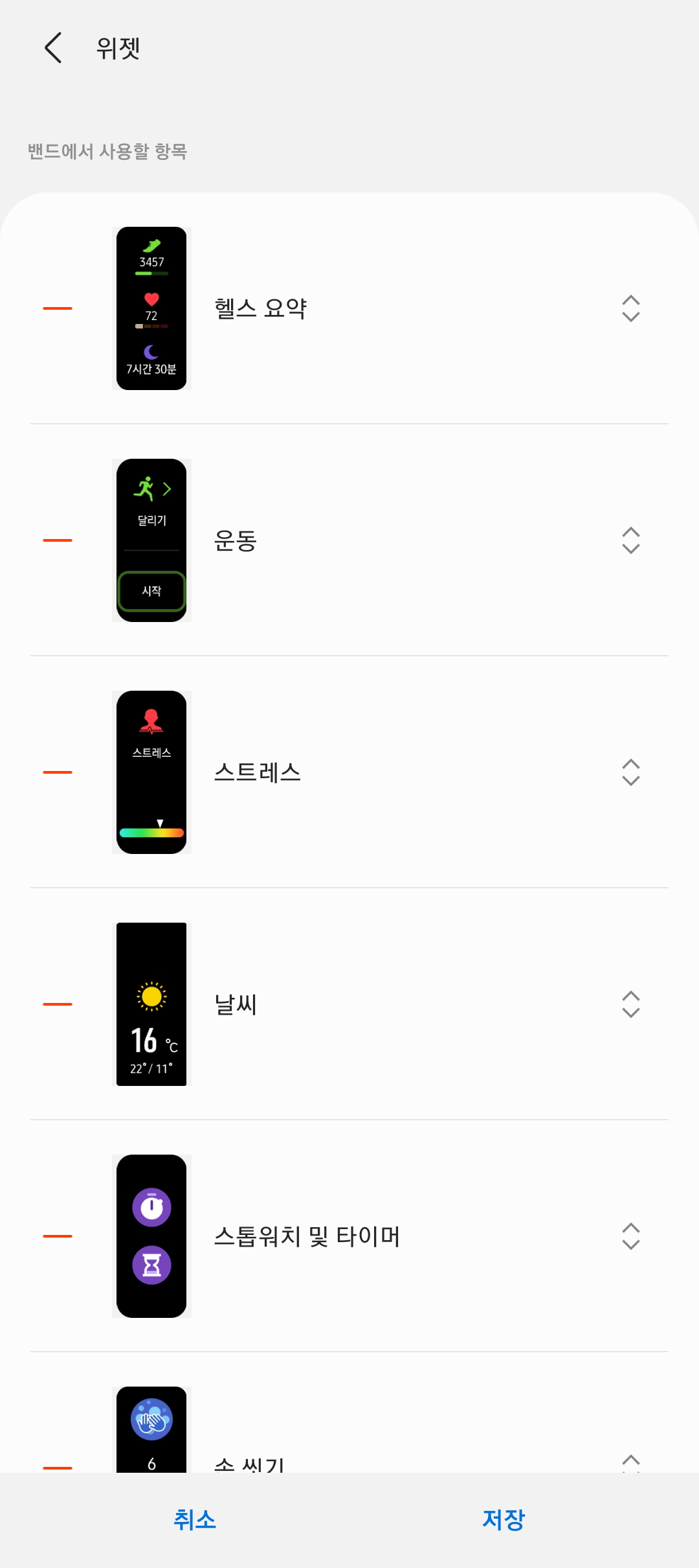 갤럭시핏2 워치 내부에서 위젯을 바꿀 수 있지는 않지만 스마트폰 앱에서 위젯을 변경할 수 있어요. 운동, 스트레스, 날씨, 스톱워치 및 타이머, 손 씻기, 수면시간 등의 기능이 있습니다.