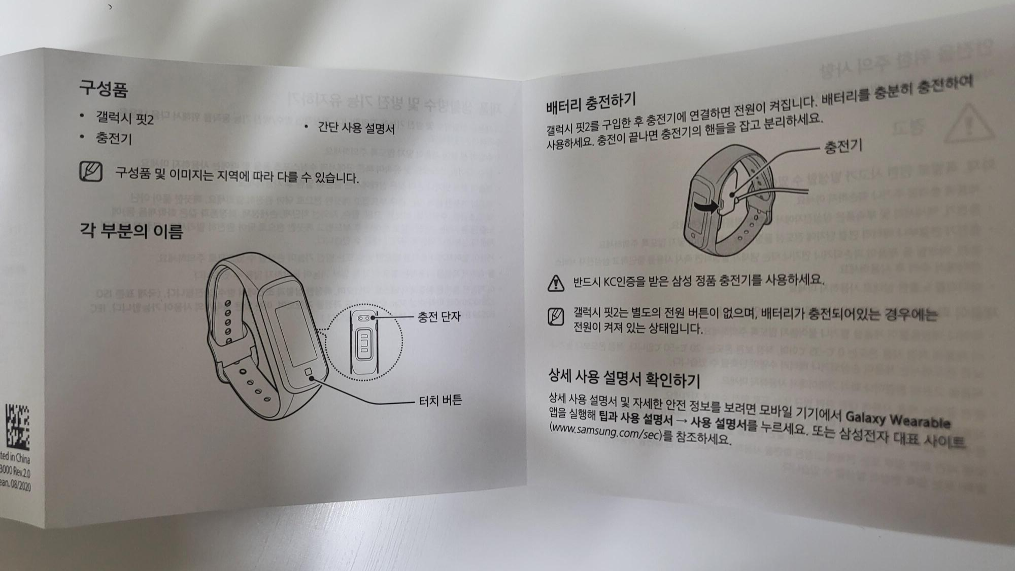 일단, 갤럭시핏2의 구성품은 본체와 충전기 그리고 간단 사용 설명서입니다.