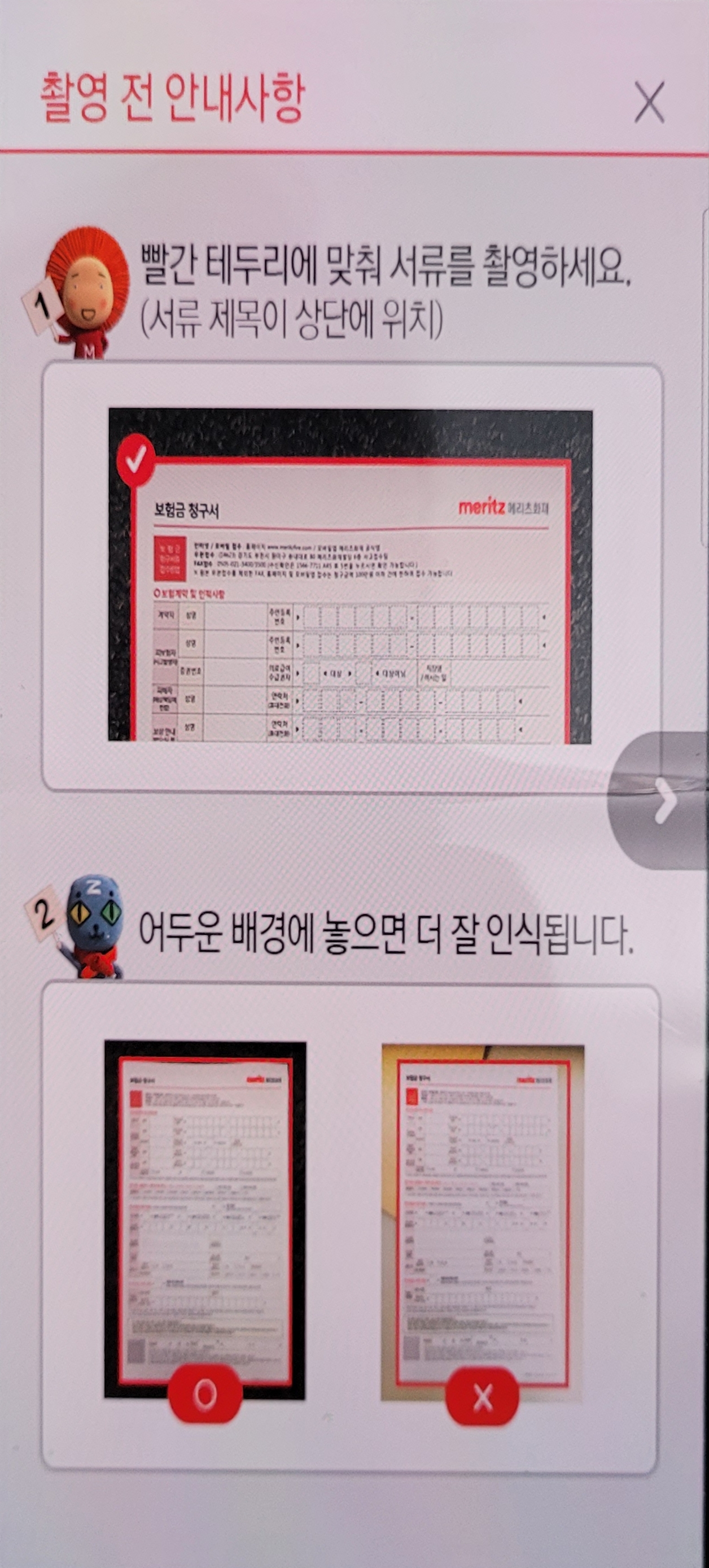 약제비 영수증, 처방전 등의 서류를 첨부하시면 되는데 빨간 테두리에 맞춰서 서류를 작성해달라는 팝업이 현시될 겁니다. 굳이 빨간 테두리에 맞추지 않아도 모든 사진을 첨부하신 후에 편집 절차를 거칠 수 있으니 완~벽하게 꼭 테두리에 맞춰야 할 필요는 없더라고요.