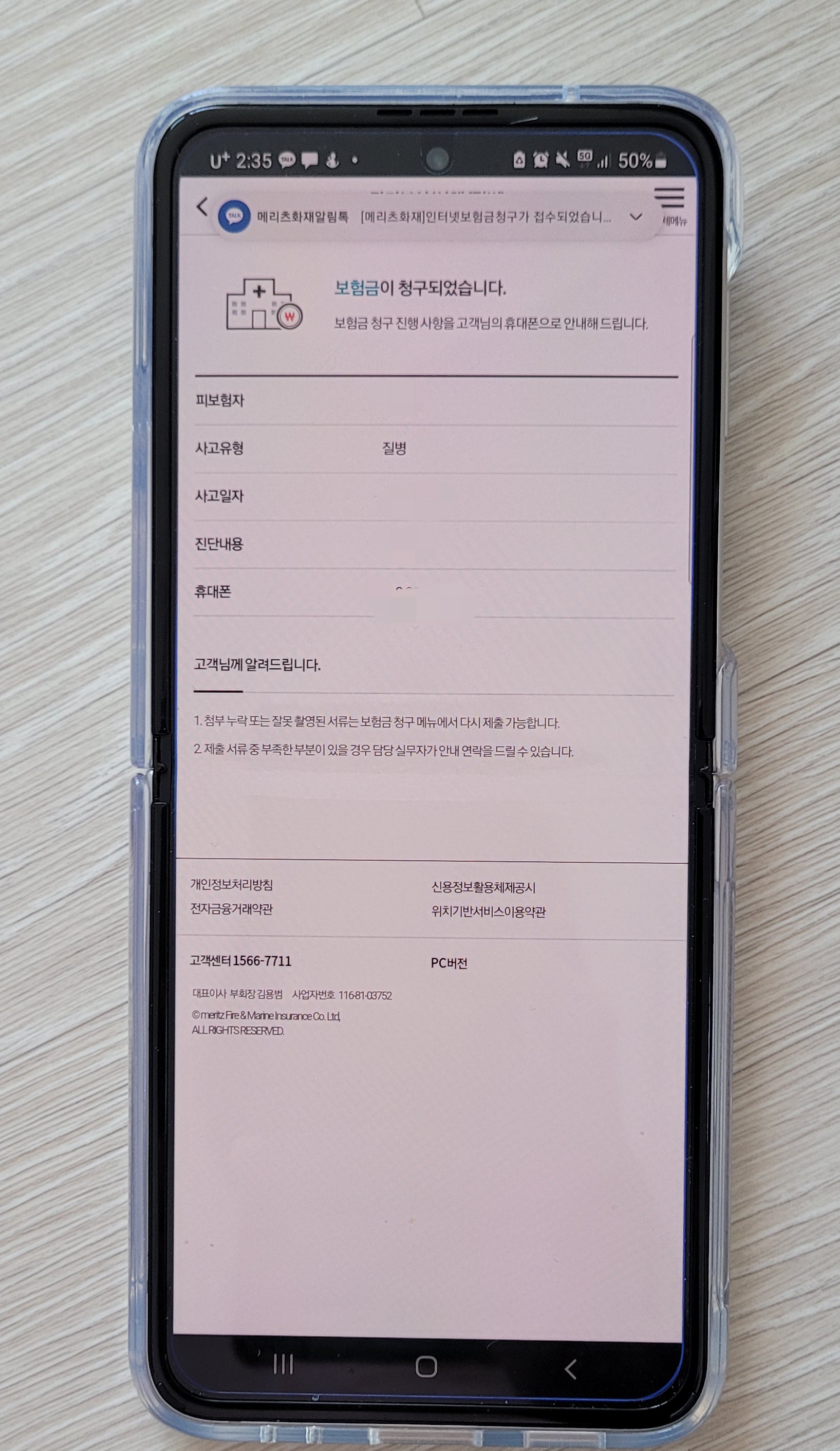 간단한 청구 절차를 거친 후에 보험금 청구가 완료되었다는 카톡이 왔어요.