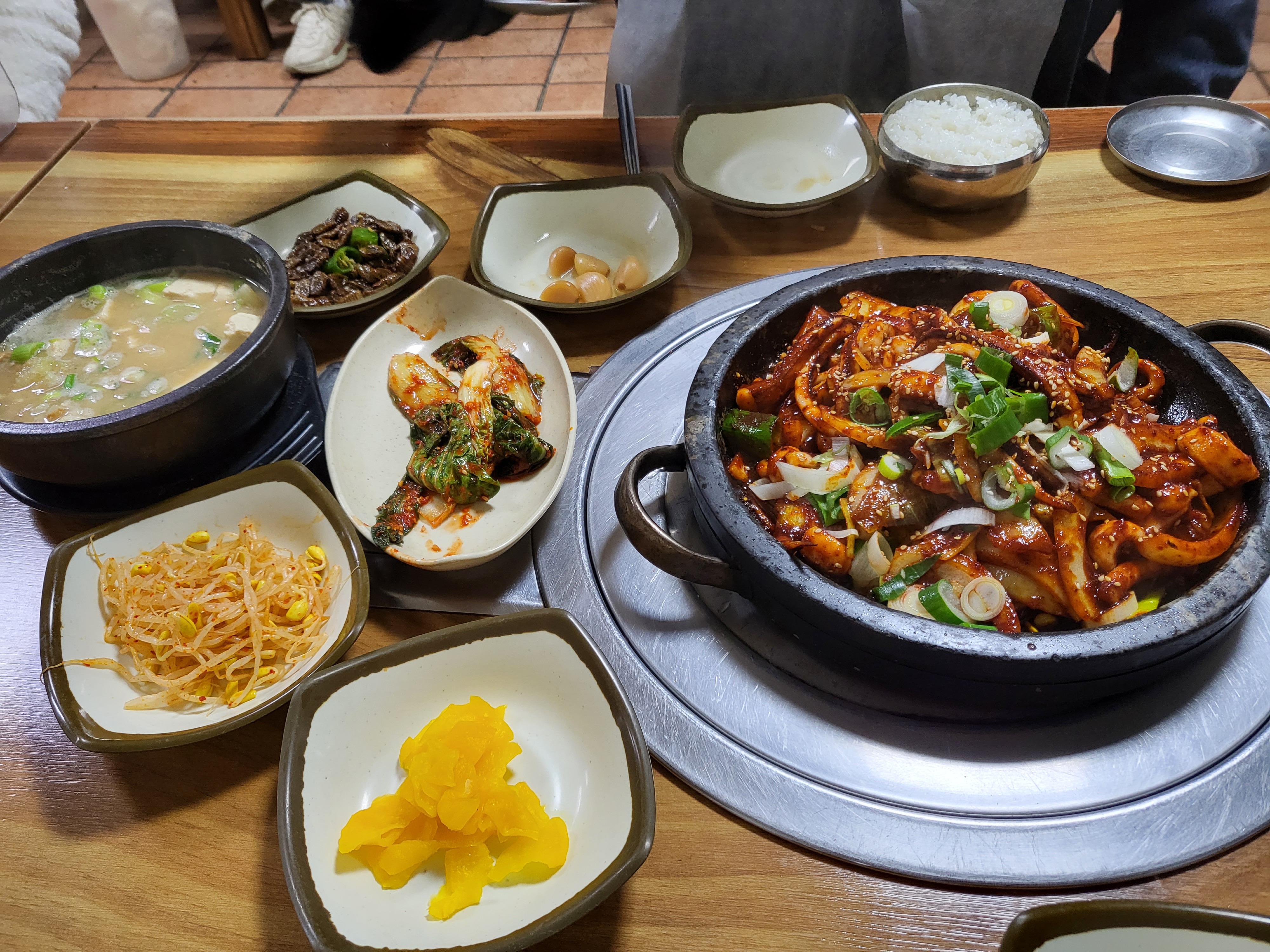 메뉴는 앞서 적은 것처럼 오징어볶음, 돼지주물럭, 청국장, 황태국이 있는데 청국장은 오징어볶음을 주문하면 한 뚝배기 나오기 때문에 굳이 주문할 필요가 없는 것 같아요. 평일 점심시간 혼밥용으로 선보이는 음식인 듯 싶어요. 공기밥은 별도인데 오징어 볶음만 시키기엔 아쉬우니 오징어볶음에 공기밥도 일단 두 개 주문했어요.