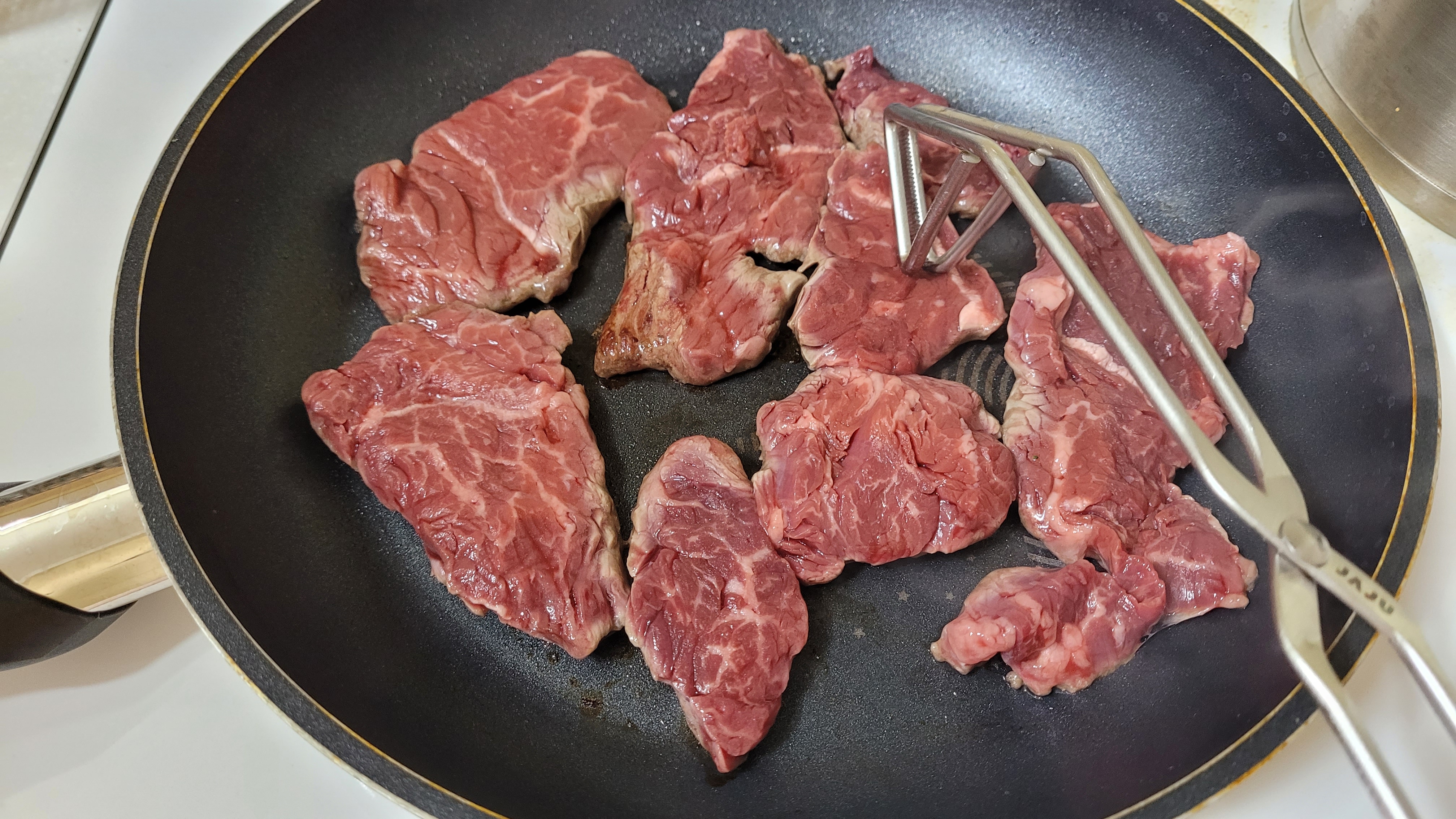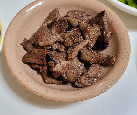 고기 자체는 토시살이라는 부위 특징 때문인지 생각보다 기름기가 적은 편이었구요. 후라이팬 주변을 기름파티한 것도 아니라서 깔끔하게 먹을 수 있었어요.