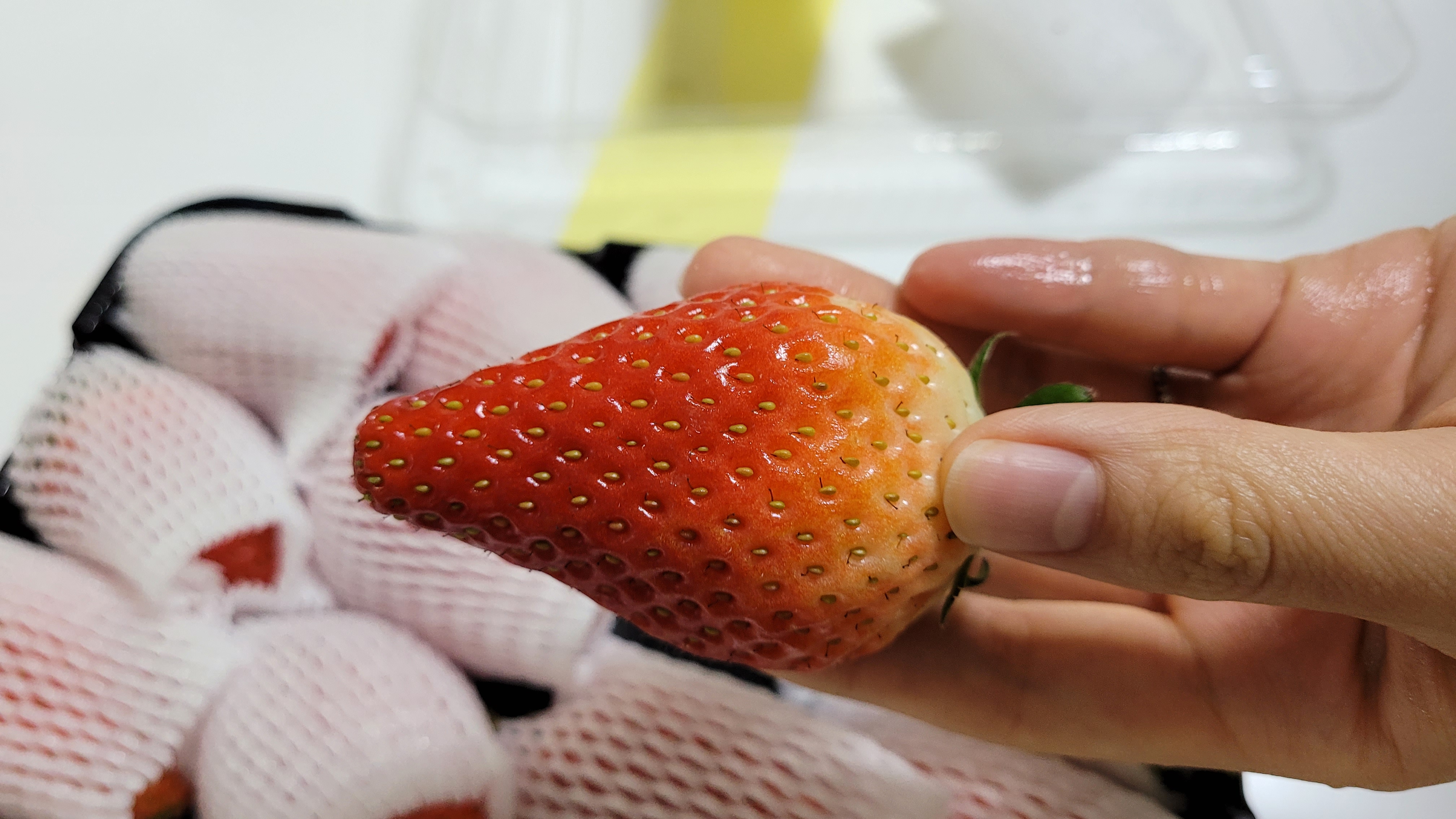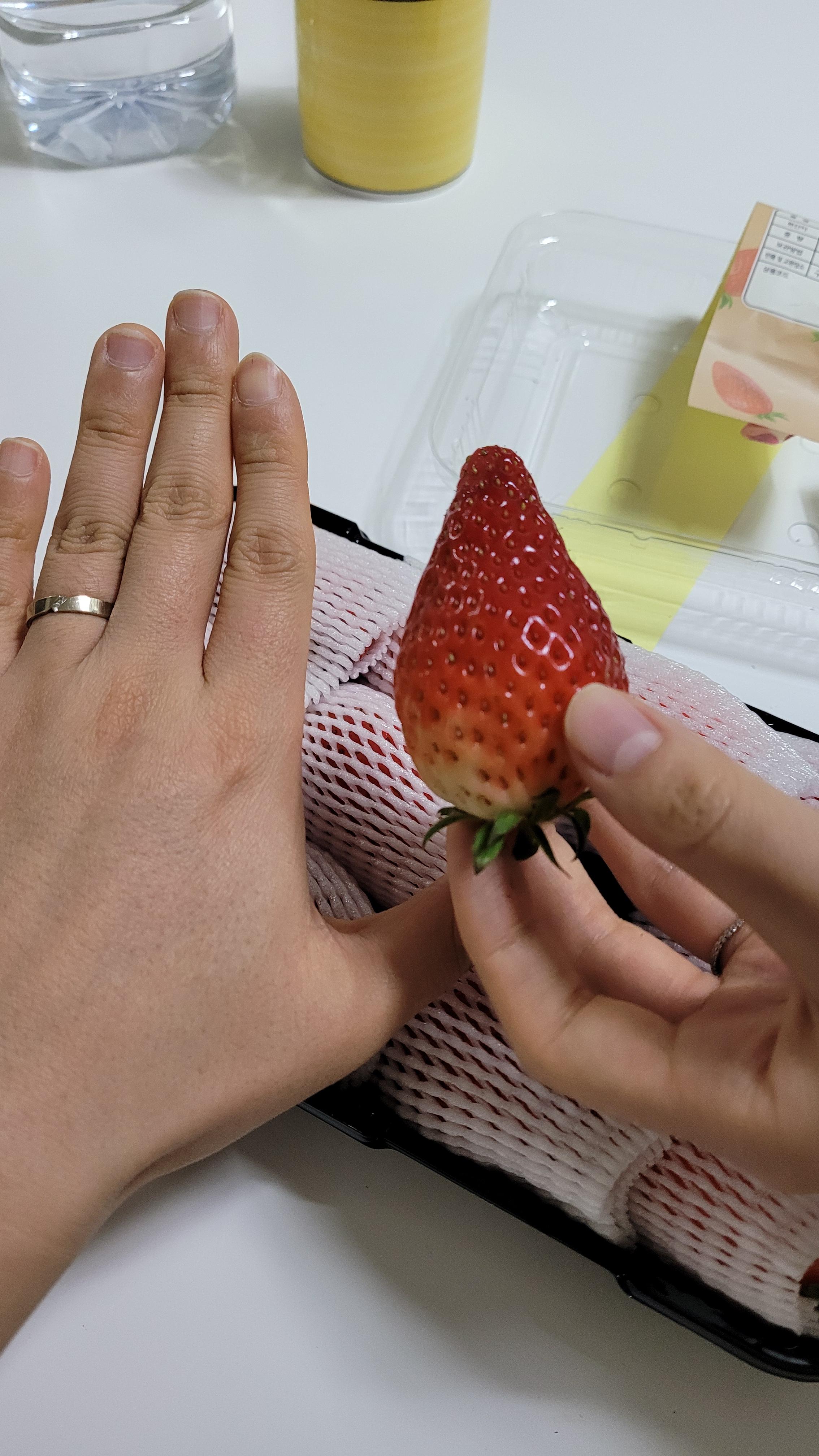 크기는 확실히 일반 딸기보다 큽니다. 딸기 길이가 두 번째 손가락만 하니 딸기 중에서의 킹이라고 불릴 만한 크기더라고요.