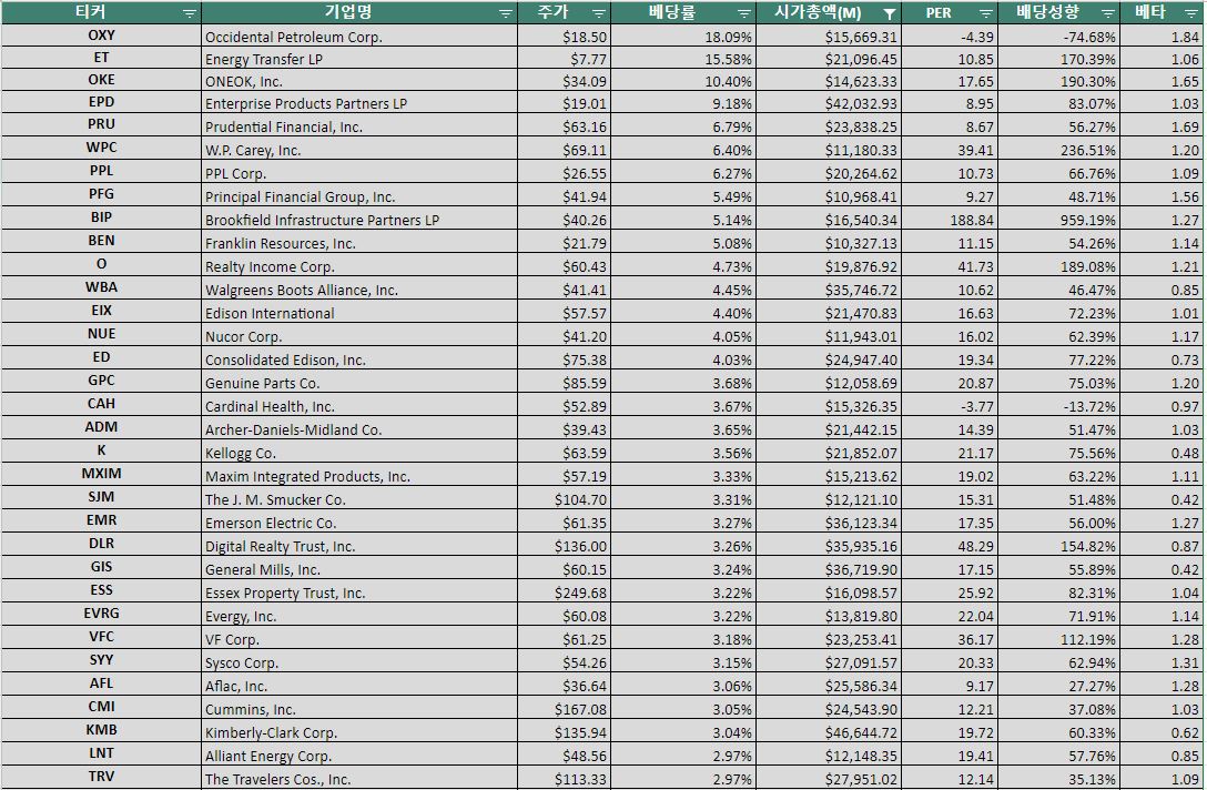 배당을 50년 이상 꾸준히 상승 및 연속지급한 기업 목록입니다. (배당률 높은 순으로 나열)