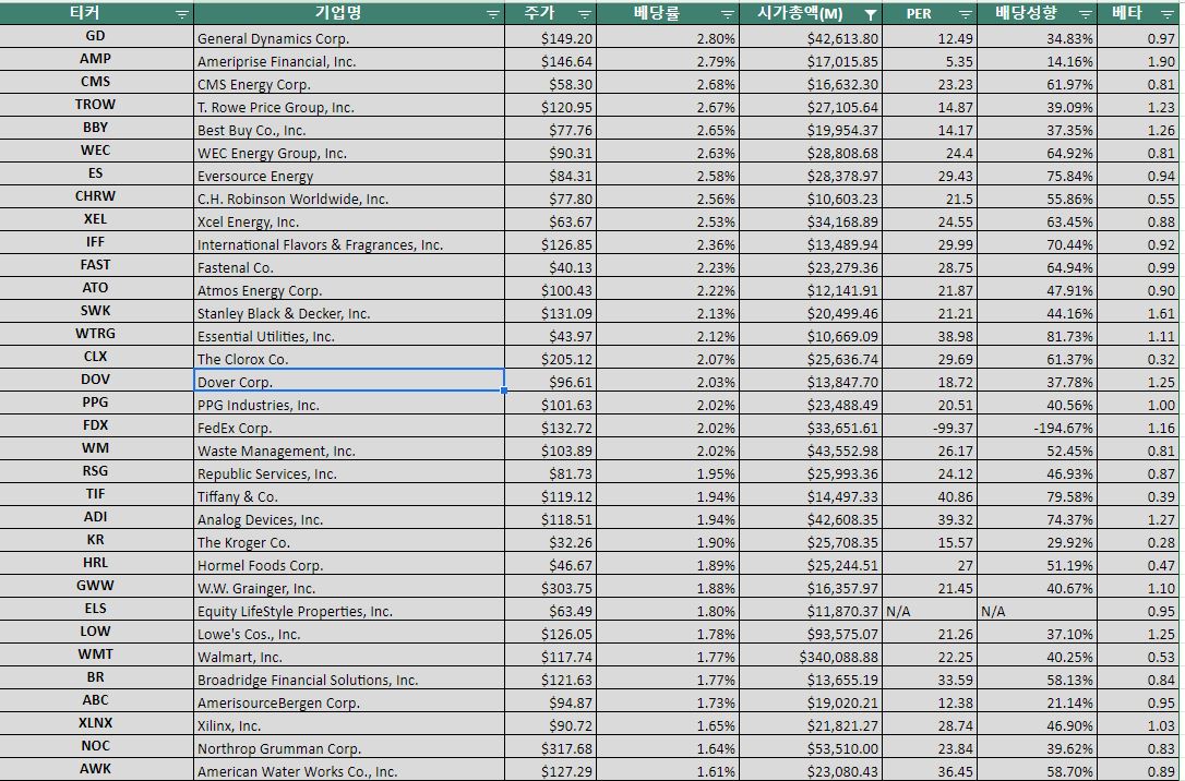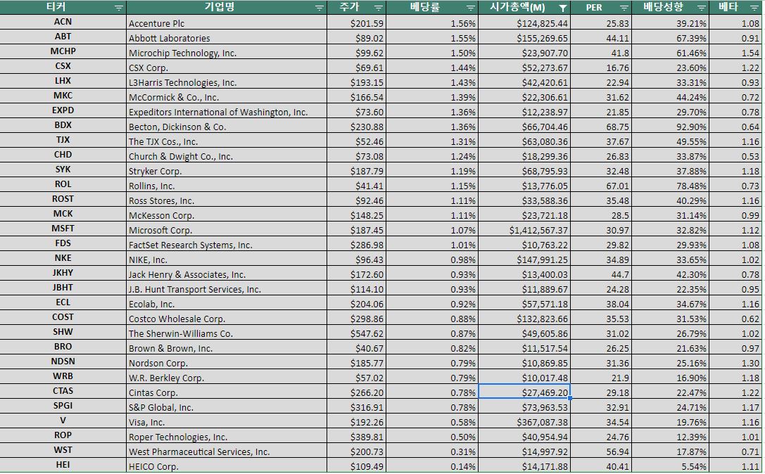 2. 배당 귀족 : Dividend Aristocrats (25+ years of rising dividends)